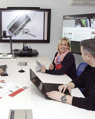 Dank eines Netzwerks von Partnertischlereien bietet das Team darüber hinaus Medienmöbel an. „Vom Rednerpult mit eingelassenem Monitor bis hin zum Sideboard, in dem zentrale Technik integriert wird, ist fast alles möglich“, sagt Düssel, der das Familienunternehmen in zweiter Generation führt. Auch wenn es um den Bereich Digital Signage geht, sind die Spezialisten kompetente Ansprechpartner. Sie kümmern sich um Präsentationen in Form von Displays, Projektionen oder LED-Wänden und entwickeln sogar Sonderlösungen. So realisierte VMT beispielsweise ein spezielles Aufrufsystem für Krankenhäuser, das die Bewegungsabläufe von Patienten analysiert. Anhand der Daten können dann Prozesse optimiert werden. Zudem erhalten Besucher über Displays Informationen zu ihrer persönlichen Wartezeit. VMT bedient neben Auftraggebern aus der Medizin auch Ver- und Entsorger, Industriekunden, Bildungseinrichtungen, Banken, Versicherungen oder Handelsunternehmen. „Bei allen Projekten hat Qualität Priorität“, betont der Geschäftsführer. Schließlich wolle man nicht nur einmal für den jeweiligen Auftraggeber tätig werden, sondern eine langfristige, für beide Seiten erfolgreiche Kundenbeziehung aufbauen. „Auch nach der Installation der Technik sind wir für unsere Kunden da und bieten schnellen Service, um Hilfestellungen zu geben.“ Großen Wert lege er außerdem auf ein gutes Betriebsklima: „Nur wenn’s intern stimmt, können wir extern die besten Leistungen abrufen.“