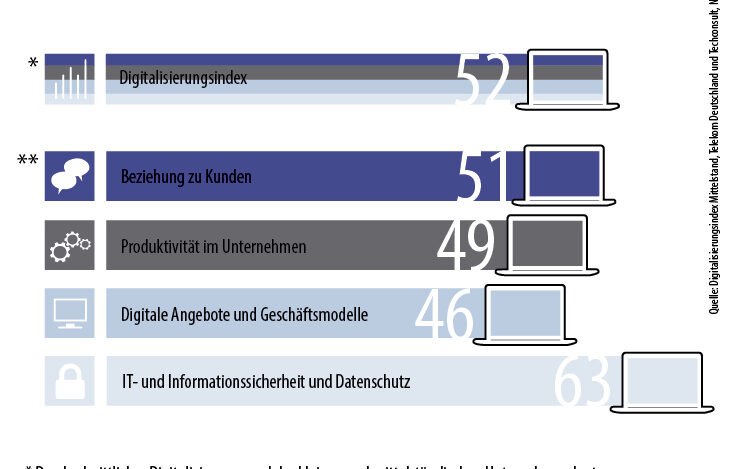 Ob Sale im Online-Shop, Cloud-gesteuerte Produktion oder Datenanalyse in Echtzeit – die Digitalisierung offenbart sich für jedes Unternehmen in einem anderen Licht und ist für jede Branche von anderer Bedeutung. Ein Beispiel: Während deutsche Unternehmen aus der Fertigungsindustrie sowie Dienstleister die Digitalisierung für sehr wichtig erachten, begreift im Baugewerbe nur jedes fünfte Unternehmen die Digitalisierung als Chance. Zu diesem Ergebnis kamen 2016 die Deutsche Telekom und Techconsult mit ihrer Studie „Digitalisierungsindex“. Dabei ist heute unbestritten, dass die digitale Transformation zusammen mit der fortschreitenden Globalisierung längst zu einem der wichtigsten Erfolgsfaktoren für die Wirtschaft und insbesondere den Mittelstand geworden ist. Die Digitalisierung lässt neue Geschäftsmodelle entstehen, bringt neue Technologien mit sich und verändert dabei ganze Wertschöpfungsketten oder Organisationen. Um Schritt mit bestehenden oder neuen Wettbewerbern zu halten, müssen Unternehmen daher ihre Strategie überprüfen und diese um neue Aspekte der Digitalisierung erweitern. Dies haben wir bereits hinreichend im ersten Beitrag unserer Serie mit der Frage nach dem Warum beantwortet. In unserem zweiten Beitrag möchten wir uns nun näher mit dem Was beschäftigen.