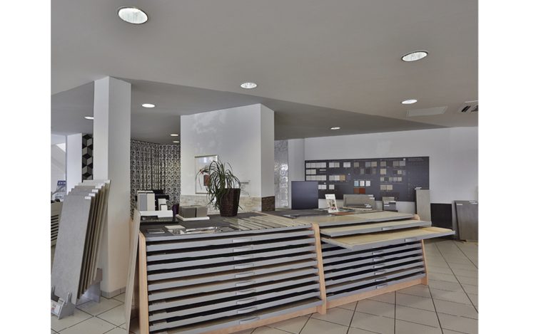 Hier kann der Kunde auf einer riesigen, digital verlegten Fliesenfläche stehen und sich die Welt der Fliesen zu Füßen legen lassen. Das riesige, vielfältige Sortiment kann als Originalmuster und als digital verlegte Fläche, in jeder Farbe und in jedem Format, begutachtet werden.