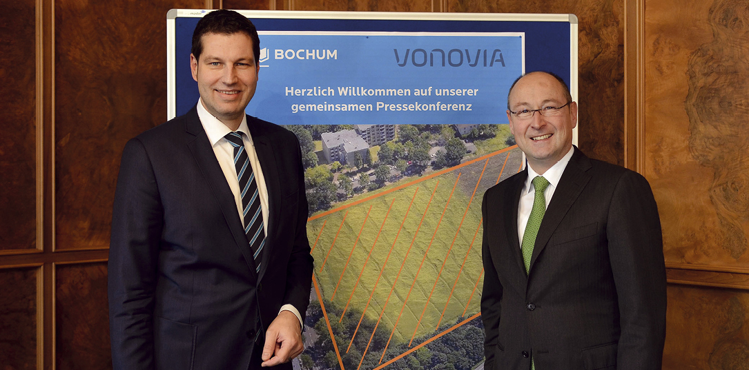 Vonovia will in Bochum bleiben und plant, neu zu bauen. Das Immobilienunternehmen erwirbt für den Neubau eine rund 30.000 Quadratmeter große Fläche im Bochumer Stadtteil Wiemelhausen an der Wasserstraße/Paulstraße. „Das ist ein Meilenstein für den Wirtschaftsstandort Bochum. Ich freue mich sehr, dass dieses DAX-Unternehmen in Bochum bleibt und expandiert. Dies ist auch ein Ergebnis der engagierten Arbeit von Wirtschaftsentwicklung und Stadtplanung“, sagte Oberbürgermeister Thomas Eiskirch. „Ich freue mich, dass wir gemeinsam mit der Stadt so zügig zu einem Ergebnis gekommen sind. Dafür möchte ich mich bei Bochums Oberbürgermeister Herrn Eiskirch herzlich bedanken. Wenn man in einer Stadt groß geworden ist, sollte man auch zu ihr stehen, wenn man sich als Unternehmen auf die nächste Stufe weiterentwickelt. Wir sind überzeugt, dass wir auch in Zukunft mit der Stadt und der Wirtschaftsförderung konstruktiv und gut zusammenarbeiten werden“, sagte Rolf Buch, Vorstandsvorsitzender von Vonovia, auf einer Pressekonferenz im Bochumer Rathaus. Ralf Meyer, Geschäftsführer der Wirtschaftsförderungsgesellschaft: „Die Wirtschaftsentwicklung Bochum kann DAX-Unternehmen wie Vonovia attraktive Flächen bieten, damit diese vor Ort weiter wachsen können, um für die Herausforderungen der Zukunft gewappnet zu sein.“ Der Startschuss für den Bau soll nach Baugenehmigung vorausichtlich Ende 2016 fallen.