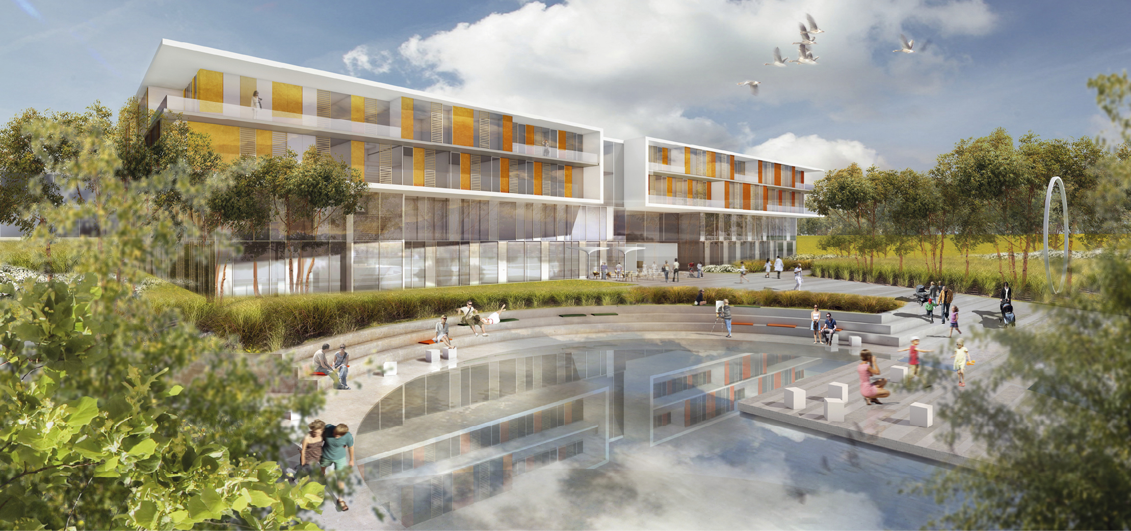 Die Visualisierung des Patientenzimmers zeigt den Beitrag zur Aufgabenstellung „visionäre“ Kinder- und Frauenklinik beim Wettbewerb „Das Neue Hauner“ des Klinikums der LMU München. Durch eine helle Farbgestaltung innen und außen wird eine heitere und freundliche Atmosphäre erreicht, die sowohl den Genesungsprozess der Kinder und Mütter maßgeblich fördert als auch die Arbeitsplatzqualität verbessert. Der Gedanke eines transparenten und lichtdurchfluteten Krankenhauses durchzieht den Neubau. Durch Rhythmisierungen, Aufweitungen, Lufträume und die ständige Blickbeziehung nach außen wird der Innenraum abwechslungsreich und kommunikativ gestaltet. Für den Landschaftsverband Rheinland wird einer der zurzeit größten und anspruchsvollsten Psychiatrie-Neubauten in Deutschland mit einem Gesamtbauvolumen von rund 65 Millionen Euro für den ersten Bauabschnitt realisiert. Es entsteht das Diagnostik-, Therapie- und Forschungszentrum (DTFZ) als das neue Zentrum des LVR-Klinikums Düsseldorf. Der erste Bauabschnitt beinhaltet Pflegestationen mit 287 Betten (Regel- und Wahlleistungsangebote) und acht Tagesklinikplätzen, Untersuchungs- und Behandlungsangebote der Allgemeinpsychiatrie, der Gerontopsychiatrie und der Neurologie einschließlich einer Stroke-Unit. Neben Laboren sind diagnostische Funktionsbereiche der Radiologie (MRT und CT) sowie physikalisch-therapeutische Angebote geplant. Es entstehen zwei Gebäudekörper, verbunden über eine Eingangshalle in der städtebaulichen Hauptachse, der Lindenallee, mit Verbindungsbrücken. Hier wird ein Ort der seelischen Gesundheit sowie einer hohen funktionalen und menschlichen Qualität entstehen. Die klare Architektur strahlt eine hohe Signifikanz aus, fügt sich aber dennoch in das Gebäudeensemble des LVR-Klinikums ein. Transparenz und Rückzugsräume, Holz sowie Akzentfarben erzeugen im Gebäudeinneren eine geschützte, warme und harmonische Atmosphäre.