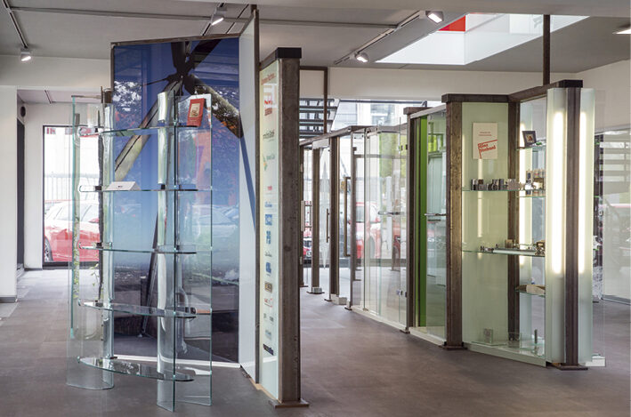 Im Essener Norden, nicht weit vom Stadthafen und der Trimet-Aluhütte, präsentiert die Firma Glas Stebani ihr hochmodernes Glaszentrum. In einem 240 Quadratmeter großen Showroom kann man zahlreiche Anwendungsbeispiele sehen, die die große Individualität der Glasgestaltung deutlich machen. Glastüren in verschiedenen Ausführungen, Wände aus Glasbaustein die von innen beleuchtet werden können, Duschkabinen aus gebogenem Glas oder Spiegel in allen Varianten machen die Wandlungsfähigkeit des Werkstoffes Glas deutlich. Beeindruckend sind auch die raumhohen Glaswände im Bürotrakt der Firma. Sie schaffen schallgedämmte Arbeitsräume und lassen dabei die Großzügigkeit der Transparenz nicht vermissen. Die freie Sicht macht vielfache visuelle Kommunikation zwischen den Verwaltungsabteilungen, Vertrieb und Marketing möglich, und natürlich hebt die präsente Helligkeit des Tageslichts die Stimmung der Mitarbeiter. Vom Konferenzraum schaut man durch eine große Glasscheibe hinunter in die 600 Quadratmeter große Werkstatt mit hochmodernen Maschinen und einem großen Glaslager.