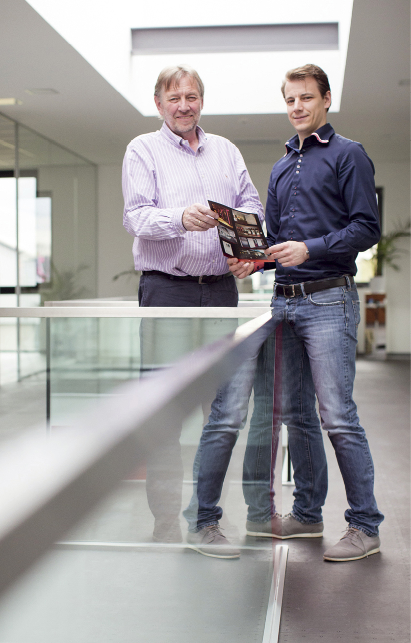 Für Klaus und Tim Stebani gab es keinen Zweifel, dass ihr im November 2013 neu eröffneter Firmenstandort ein Paradebeispiel für Glas-Innovationen und die Möglichkeiten der technischen Verarbeitung des Werkstoffs Glas werden sollte. Dennoch ist das Unternehmen auch seinem traditionellen Anspruch als Familienbetrieb immer treu geblieben. Glas Stebani ist seit mehr als 65 Jahren der professionelle Dienstleister für die Be- und Verarbeitung von Glas. Gegründet von Hans Stebani, ging der Betrieb zunächst an den Sohn Klaus Stebani über, bis mit Tim Stebani vor fünf Jahren auch die dritte Familiengeneration in die Unternehmensleitung kam. Vom 28-köpfigen Mitarbeiterteam sind ständig 16 hoch qualifizierte Monteure in ganz Nordrhein-Westfalen auf den Baustellen oder beim Kunden im Einsatz. Sie montieren Spiegel, Glas-Vordächer oder Glastüren und stehen für die Reparatur von zerbrochenen Scheiben u.a. im 24-Stunden-Glas-Notdienst zur Verfügung. Klaus Stebani: „Mit unserer langjährigen Erfahrung in der Glasbranche und modernster Technik sorgen wir für eine effiziente, zuverlässige und kostenoptimierte Ausführung unterschiedlichster Glasarbeiten.“ Daher vertrauen auch führende Großhandels- und Ladenketten der Firma Stebani deutschlandweit ihr „Glas-Management“ an: „Gibt es bei unseren Kunden Schwierigkeiten mit einer Glastür, einen Glasbruch oder muss eine Automatiktür eingestellt werden, sind wir selber oder mit unseren bundesweiten Netzwerkpartnern in kürzester Zeit vor Ort, um die Funktionalität zu gewährleisten“, stellt Tim Stebani den Serviceanspruch in den Vordergrund. Stolz ist er „als treues Kind des Ruhrgebiets“ auch auf Referenzprojekte wie das Weltkulturerbe Zeche Zollverein und das Ruhr Museum, für die Glas Stebani nicht nur die Außenverglasung, sondern auch zahlreiche Glasvitrinen liefern konnte. Daher schmückt der Doppelbock von Zollverein auch eine überdimensionale Glaswand im Stebani-Showroom: „Ein ganz innovatives digitales Druckverfahren, bei dem wir das fotorealistische Motiv direkt auf die Glasplatte drucken können“, freut sich Tim Stebani über die neueste Innovation des Hauses.
