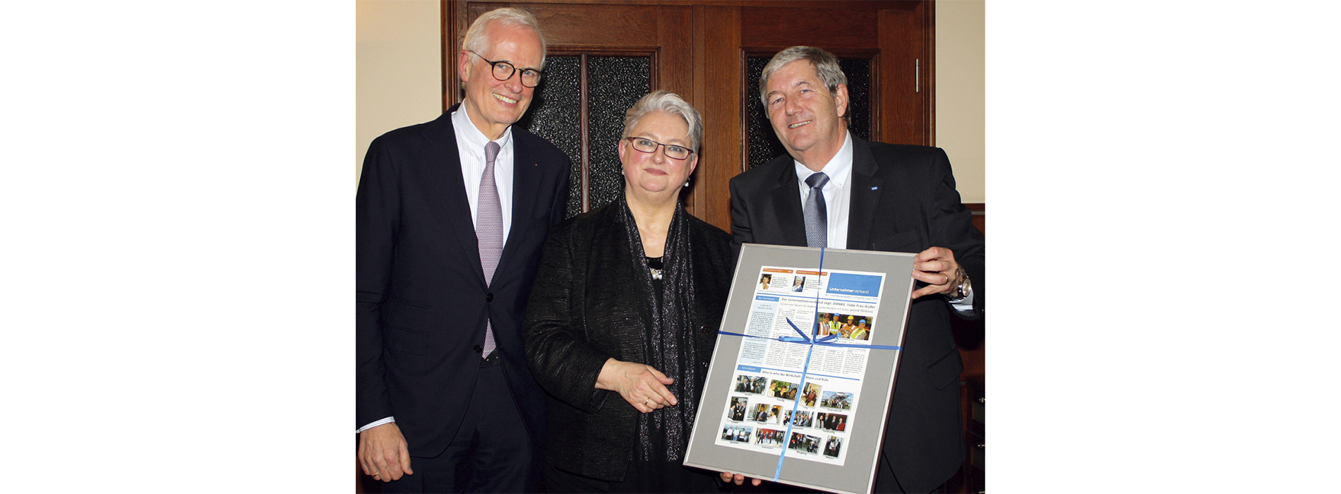 Zum Abschied in den Ruhestand überreichten Hauptgeschäftsführer Wolfgang Schmitz (re.) und Vorsitzender Robert Prager eine persönliche Titelseite der Verbandszeitung an Monika Guder Foto: Unternehmerverband