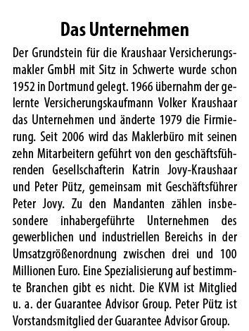 Für die Ermittlung des tatsächlichen Versicherungsbedarfs ist ein Risikokonzept mit Risikoanalyse unabdingbar. Und genau damit beginnt auch die Arbeit bei der Kraushaar Versicherungsmakler GmbH, kurz: KVM. „Noch bevor wir die bestehenden Vertragsverhältnisse neuer Mandanten überprüfen, ermitteln wir also den tatsächlichen Versicherungsbedarf des Unternehmens“, erklärt Geschäftsführer Peter Jovy. Wie ist das Unternehmen strukturiert, welche Branche deckt es ab, welche Produkte liefert es und welche Dienstleistungen erbringt es? Welche Technik kommt zum Einsatz? Sind die daraus resultierenden Risiken ermittelt, gilt es, die bestehenden Versicherungsverhältnisse auf Über- und Unterdeckungen zu prüfen und schließlich zu ermitteln, wie die Risiken durch neue Policen besser – bzw. zu besseren Konditionen – abgesichert werden können. Eine überaus anspruchsvolle Aufgabe. „Das A und O ist das Vertrauen zwischen uns und dem Kunden“, sagt die geschäftsführende Gesellschafterin Katrin Jovy-Kraushaar. „Dieses zählt aber nicht nur bei der erstmaligen Ermittlung des optimalen Versicherungsschutzes und der Ausarbeitung der konkreten Vertragskonditionen, sondern vor allem auch im Rahmen der langfristigen Zusammenarbeit.“ Langfristig kann bei Versicherungsmakler Kraushaar auch mal bedeuten, dass die Kundenbeziehung bereits in zweiter Generation fortbesteht. Die Kundenbindung endet daher nicht beim Vertragsabschluss, sondern beginnt erst damit. In jährlichen Gesprächen wird immer wieder geprüft, ob die bestehenden Verträge und Konditionen noch optimal sind oder ob Anpassungsbedarf besteht. „Ein neues Produkt, eine geänderte Gesetzgebung, eine neue Maschine oder ein neu erschlossener Markt – immer wieder ergibt sich neuer Handlungsbedarf“, so der geschäftsführende Gesellschafter Peter Pütz. Wirklich auf die Probe gestellt wird die Mandantenbeziehung aber erst im Schadensfall. Dann zeigt sich, ob der Versicherungsmakler gut gearbeitet hat – und dass Schaden im Sinne des Kunden erfolgreich abgewickelt werden kann. „Über 60 Jahre Erfahrung als Versicherungsmakler und die enge Mandantenbindung erweisen sich hierbei immer wieder von Vorteil“, so Katrin Jovy-Kraushaar.