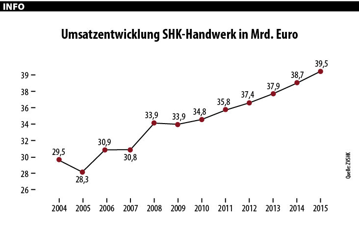 Das dominante Thema des deutschen Sanitär-, Heizungs- und Klimahandwerks lautet Energieeffizienz. Moderne Technologien wie die Brennstoffzellen-Technologie, Wärmepumpen und erneuerbare Energien setzen deutliche Wachstumsimpulse. Auch die Energie- und Gebäudetechnik, bei der digitale Anwendungen wie Apps und Smart Metering zum Einsatz kommen, bietet viele Innovationen für ein energieeffizientes, individuelles Gebäudemanagement. Das SHK-Handwerk profitiert aktuell von der weiterhin guten konjunkturellen Lage, dem klassischen Sanierungs-, Kundendienst- und Wartungsgeschäft sowie der allmählich in Gang kommenden Energiewende. Angesichts des niedrigen Zinsniveaus und steigender Mieten ist eine Modernisierung der eigenen Immobilie derzeit eine lohnende Investition. So konnte das SHK-Handwerk seine Umsätze 2015 ein weiteres Mal um knapp zwei Prozent auf nun 39,5 Milliarden Euro steigern, wie der Zentralverband Sanitär Heizung Klima (ZVSHK) meldete. Fast zwei Drittel dieses Gesamtumsatzes wurden von den rund 25.000 Innungsbetrieben erwirtschaftet. Maßgeblichen Anteil an der positiven Situation der Branche hat dem ZVSHK zufolge das Modernisierungsgeschäft. Der Zukunft blickt das SHK-Handwerk weiterhin optimistisch entgegen. Die SHK-Betriebe rechnen in 2016 mit einer weiterhin stabilen Auftragslage und erwarten die stärksten Wachstumsimpulse in den Segmenten Bäder und Heizungen.