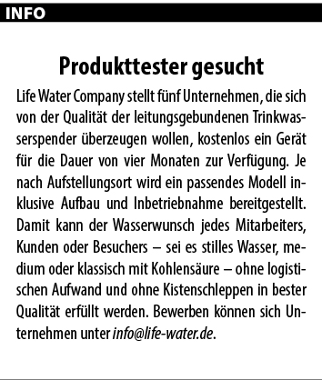 Dabei können die Wasserspender an den verschiedensten Orten eingesetzt werden: Schließlich bietet die Life Water Company ein umfangreiches Produktportfolio. Im Rahmen einer umfassenden Beratung analysiert das Team die Gegebenheiten vor Ort, entwickelt maßgeschneiderte Lösungen und erstellt komplette Versorgungskonzepte. „Wir erklären dem Kunden genau, welche Rahmenbedingungen die Anlage benötigt, wo der optimale Aufstellungsort wäre oder welche Vorschriften und Unterlagen beachtet werden müssen“, sagt Dirk Viebahn. Daneben liefern die Kamener auch Zubehör wie Becherspender, wiederverwendbare Flaschen aus Tritan und Glas, Becher oder lebensmittelgeprüfte Kohlensäure. Geliefert werden die Geräte übrigens in den verschiedensten Größen und Farben; auf Wunsch kann auch das Firmenlogo des Kunden angebracht werden. „Wir schreiben das Wort Service in ganz großen Lettern“, fügt Martin Pasel hinzu. „Bei Störungen werden Kunden in der Regel noch am gleichen Tag – spätestens nach 24 Stunden – von einem unserer bestens ausgebildeten Monteure besucht. Die Behebung erfolgt schnell und effizient.“ Auch die Wartung, Sicherheitsüberprüfung und Wasseranalyse wird vom zehnköpfigen Team übernommen. „Wasser ist unsere Leidenschaft“, sagt Dirk Viebahn voller Überzeugung. „Deshalb haben wir es uns auch zur Aufgabe gemacht, auf die Bedeutung dieses faszinierenden Elements aufmerksam zu machen.“ So unterstützte die Life Water Company unter anderem die Trinkfit-Studie, eine Aktion zum richtigen Trinken von Kindern, und stellte dafür Wasserspender zur Verfügung, mit denen sich Kids in der Schule selbst mit Trinkwasser versorgen konnten.