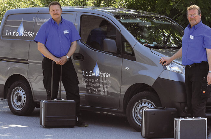 Darüber hinaus kümmert sich das Unternehmen auch um den Bereich der Wasserdesinfektion. „Wir wollen die Bevölkerung auf die Gefahren von Legionellen aufmerksam machen.“ Dabei handelt es sich um Bakterien, die verantwortlich sind für die Legionärskrankheit. Die Infektion erfolgt über die Atemwege und kann im schlimmsten Fall zum Tod führen. Offiziell werden in Deutschland 4.000 bis 6.000 Legionellen-Tote im Jahr gezählt. „Sie können im Duschkopf sitzen und über den Wasserdampf eingeatmet werden.“ Für einen gesunden Menschen stelle das kein Problem dar, wer ein bisschen angeschlagen oder besonders anfällig ist, könne jedoch gesundheitliche Probleme bekommen. Derartigen mikrobiologischen Verunreinigungen rückt die Life Water Company mit der trinkwassernormkonformen, umweltschonenden elektrolytischen Wasserdesinfektion zu Leibe. Eine sogenannte BlueBox produziert dabei durch Elektrolyse Natriumhypochlorid, das Legionellen eliminiert. „Bei sämtlichen Aufgaben halten wir uns streng an die Vorgaben der deutschen Trinkwasserverordnung“, verrät Martin Pasel, der das Unternehmen im Jahr 2001 gründete und damit Pionierarbeit leistete. „Anfangs kannten nur wenige Menschen Tafelwasseranlagen, heute haben wir mehr als 1.000 Kunden, die nicht mehr darauf verzichten möchten“, ergänzt Dirk Viebahn, der seit 2005 Mitglied der Geschäftsführung ist. Die Faszination für das nasse Element hat beide bis heute nicht losgelassen. „Wasser ist einfach ein ganz besonderer Stoff.“