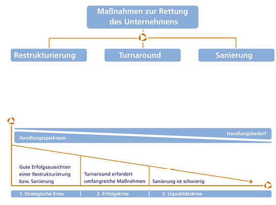 Mit zunehmender Dauer der Krise kommt das Unternehmen in Phase 2. In der „Erfolgskrise“ nimmt der Handlungsspielraum deutlich ab: „Hier sind wir mitten in einem Turnaround, der im Unternehmen gravierende Veränderungsmaßnahmen erforderlich macht!“ Es gibt aber auch hier immer noch Möglichkeiten, die Krise aus eigener Kraft abzuwenden. In der letzten Phase, der sogenannten „Liquiditätskrise“, ist das Unternehmen schon ein klassischer Sanierungsfall. „Leider werden wir in den meisten Fällen erst angerufen, wenn sich das Unternehmen schon in dieser Phase befindet. Jetzt kann es keine schnelle Sanierung mehr geben, denn hier sind alle Maßnahmen mittel- und langfristig anzulegen.“ Das kennzeichnende Problem dieser Phase ist, dass dem Unternehmen die Liquidität ausgeht: „Hohe Schulden sind nicht das größte Problem“, so Axel Deilmann, „wenn die monatlichen Zins- und Tilgungszahlungen bedient werden können. Die größte Hürde ist die nicht mehr vorhandene Liquidität!“ Diese muß als Erstes durch eine Notfinanzierung geschlossen werden, da ansonsten die Insolvenz droht.Ob die Krise schließlich mit einer Reorganisation und umgestalteten Strukturen abgewendet werden kann oder ob eine grundlegende Richtungsänderung der Geschäftsfelder erforderlich ist – das Ziel muß es immer sein, die Hauptaktivitäten des Unternehmens profitabel zu gestalten. Ist erst eine Sanierung erforderlich, ist die Wiederherstellung der Leistungsfähigkeit des Betriebes nicht ohne schmerzliche Einschnitte und Veränderungen möglich. Um das zu vermeiden, sollte ein Unternehmer schon bei den ersten Anzeichen einer Krise den Rat von Deilmann Business Consulting einholen. In jedem Fall ist es unerlässlich, einen erfahrenen Berater zu haben, der bestens mit Banken sowie Investoren vernetzt ist. Axel Deilmann: „Unser Ziel ist es, Unternehmen in Schwierigkeiten den entscheidenden Weg aus der Krise aufzuzeigen.“