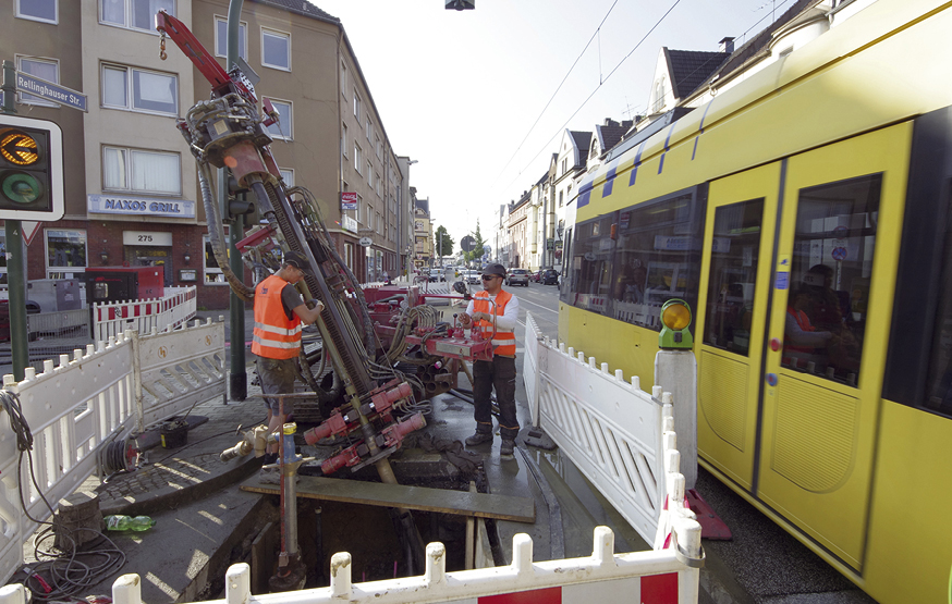 Umfangreiche Kanalbaumaßnahmen standen in diesem Jahr im Bereich Rellinghauser Straße für die Essener Stadtwerke auf dem Plan. Man vermutete ein ehemaliges, nicht verzeichnetes Abbaugebiet. Mit den Erkundungsbohrungen wurden gefürchtete Hohlräume entdeckt. Durch Verfüllung und Verpressung konnten das untergründige Lockermaterial und auch die Löcher in einen für den Kanalbau tragfähigen Boden umgewandelt werden.