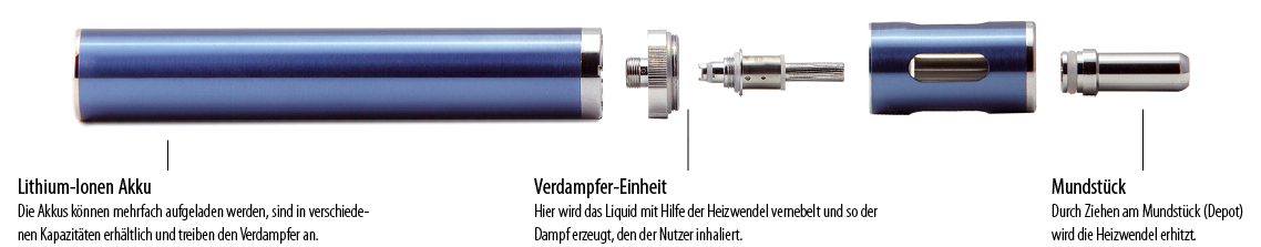 In der E-Zigarette wird im Gegensatz zur herkömmlichen Zigarette kein Tabak verbrannt und inhaliert, sondern eine meist nikotinhaltige Flüssigkeit verdampft. Daher entsteht durch E-Zigaretten kein Rauch. E-Zigaretten sind als Einwegmodelle und als Tanksysteme erhältlich. Technisch besteht die E-Zigarette aus einem Mundstück, einem Verdampfer und einem Akku. Wird am Mundstück gezogen, erhitzt die Elektronik eine Heizwendel in der Verdampfer-Einheit, die das Liquid vaporisiert. E-Zigaretten können verschiedene chemische Stoffe enthalten. So gibt es beispielsweise E-Liquids mit und ohne Nikotin. Die meisten Liquids enthalten bis zu fünf Substanzen: Propylenglykol, Glyzerin, destilliertes Wasser, Aromastoffe und gegebenenfalls Nikotin.