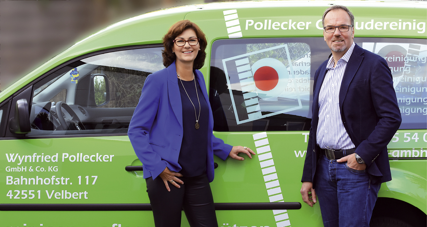 Angelika Osterdell gehört zu den Chefinnen, die genau wissen, was ihre Mitarbeiterinnen und Mitarbeiter tagtäglich leisten. „Ich bin gelernte Glas- und Gebäudereinigerin, habe mit 19 Jahren meine Ausbildung in Düsseldorf begonnen“, erzählt die Unternehmerin. Damals, in den 80er-Jahren, stieg sie so in die Fußstapfen ihres Vaters: Wynfried Pollecker, von Hause aus eigentlich Maurer, hatte vor mehr als 50 Jahren das gleichnamige Unternehmen für Gebäudereinigung gegründet. Inzwischen ist er im Ruhestand. Seit 15 Jahren führt seine Tochter die Firma, unterstützt von Ehemann und Betriebsleiter Helge Osterdell, der u.a. für den Kundenkontakt zuständig ist. In Velbert und Umgebung sind die Spezialisten für saubere Büros, Arztpraxen, Mietwohnungen, Autohäuser, öffentliche Gebäude oder Privathäuser bekannt und gefragt. Auch aus der Industrie kommen zahlreiche Kunden. Darunter sind – wie könnte es in Velbert auch anders sein – diverse Schloss- und Beschlägehersteller. Helge Osterdell, der früher als Industriemeister tätig war, kommt selbst aus dieser Branche. In Sachen Bauabschlussreinigung arbeitet man mit Architekten und Bauunternehmen zusammen. „Wir sind Mittelständler für den Mittelstand“, bringt es die Geschäftsführerin auf den Punkt.