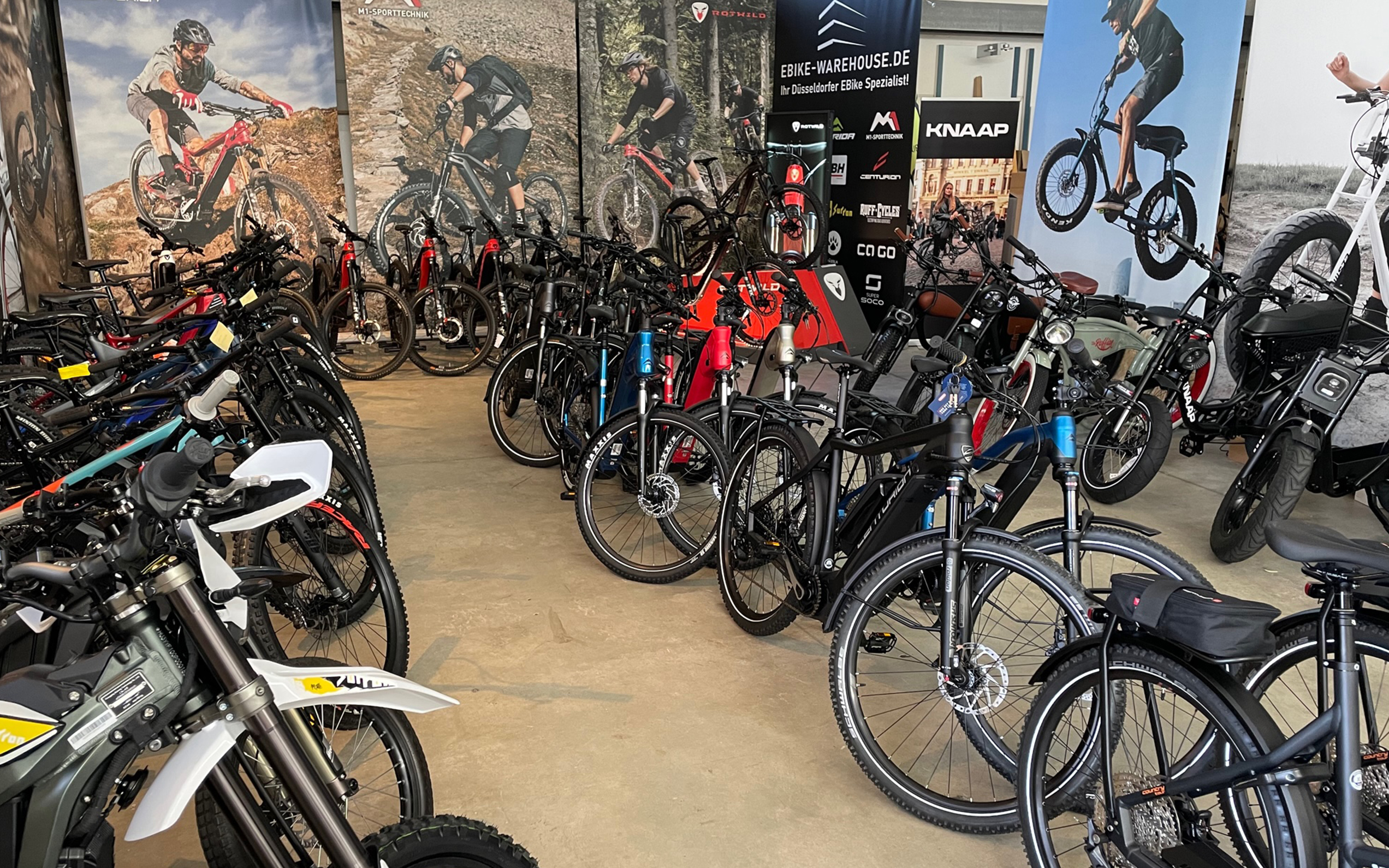 Das Ebike-Warehouse in Düsseldorf ist Test-Center, Showroom und Werkstatt für top ausgestattete EBikes, Pedelecs, E-Mountainbikes, E-Enduros und E-Familien-Lastenräder. Bei einem Getränk kann man im Gewerbegebiet Düsselbogen in der Hoffeldstraße 104 in Ruhe die verschiedensten EBikes testen und sich bestens beraten lassen. Die Auswahl an guten EBikes und Pedelecs ist hier besonders groß und die Top-Marken findet man in Düsseldorf nur im Ebike-Warehouse, wie z. B. Rotwild, Cowboy, Coboc, Super73, Rocky Mountain, Centurion, Merida, Sur-Ron, M1-Sporttechnik, Ruff Cycles, QWIC, MC-Ebikes, Whyte Bikes, Butchers & Bicycles, Ca Go und Greyp.