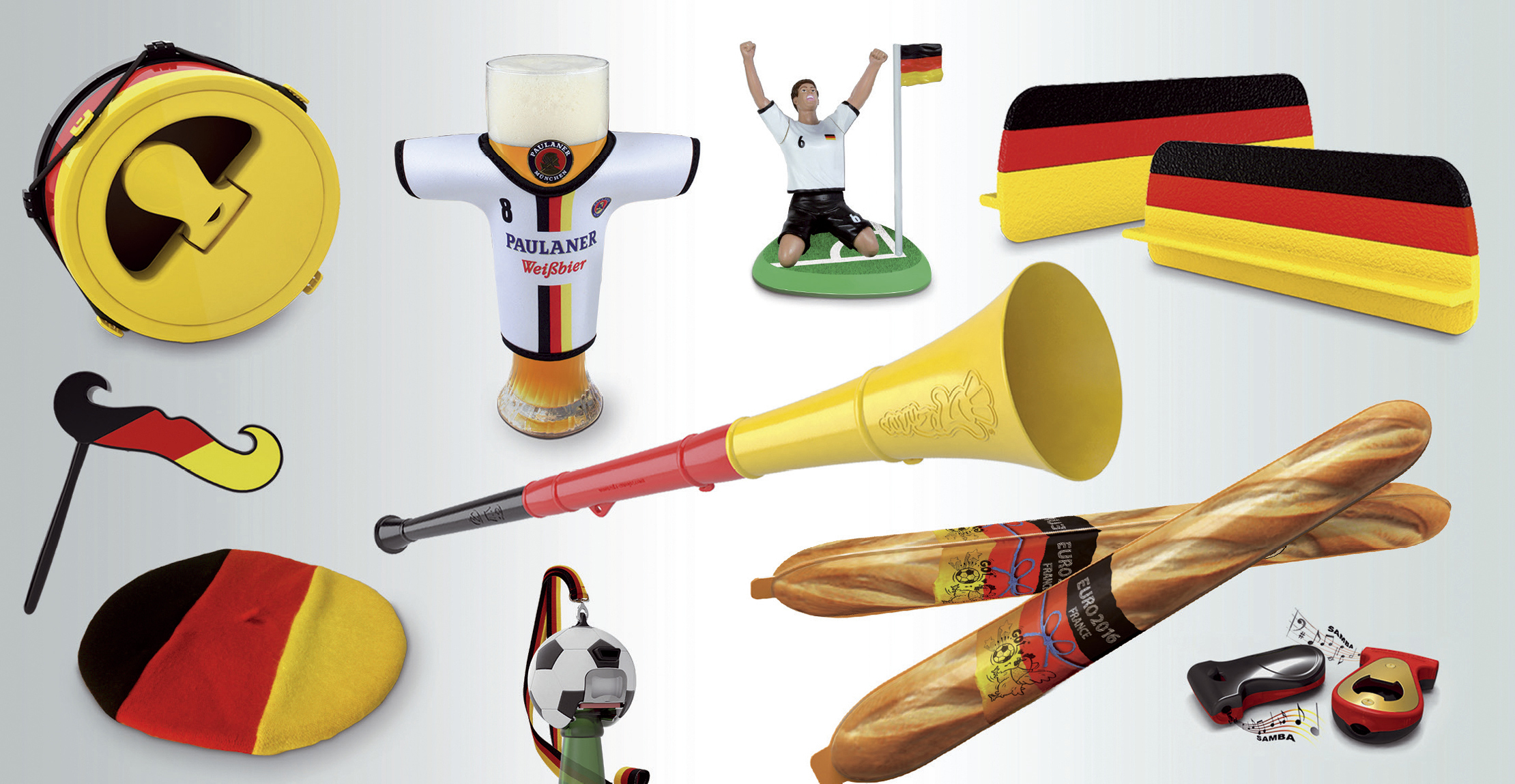 Selbstverständlich haben die Düsseldorfer Unternehmer auch in diesem Jahr ein umfangreiches Sortiment an ausgefallenen Fanartikeln bereitgestellt. Noch wenige Wochen bis zum Anpfiff in Frankreich – lassen wir uns überraschen.