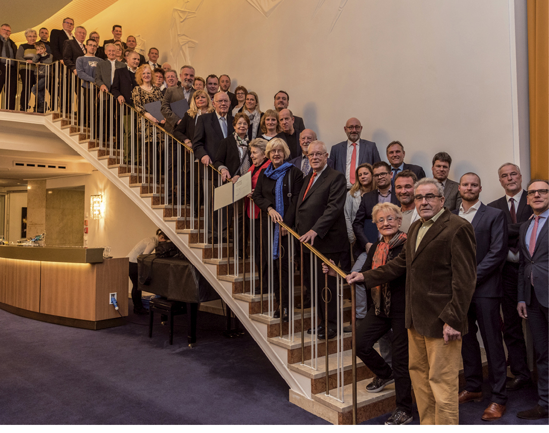 Zum vierten Mal fand Mitte Dezember 2017 auf Einladung des Oberbürgermeisters gemeinsam mit der Wirtschaftsförderung Wuppertal der Jubiläumsempfang für Unternehmen im Kronleuchterfoyer des Opernhauses statt. Die Mehrzahl der 16 teilnehmenden Firmen sind Familienunternehmen und waren zumeist gleich mit mehreren Generationen vertreten. In den letzten beiden Jahren konnten 22 Unternehmen ihr 50., 75., 100., 125., 150. oder sogar 200. Jubiläum feiern. Um ihnen die Wertschätzung für diese besondere Unternehmensleistung auszudrücken, ist es bereits gute Tradition, sie zum Jubiläumsempfang einzuladen. Zwischen den geehrten Unternehmen fand ein reger Austausch statt und so manche neue Netzwerkverbindung wurde geknüpft. Ein weiterer Aspekt dieser Feier ist es, den Dialog zwischen Unternehmen und Stadt zu fördern. „Wir sind als Ansprechpartner für Sie da“, betonte Oberbürgermeister Andreas Mucke in seiner Begrüßung. Er warb darum, den direkten Kontakt zu seinem Büro und zur Wirtschaftsförderung zu nutzen, wenn Fragen oder Problem auftauchen. Besonders berührte, dass der ein oder andere Senior – längst nicht mehr selbst im Geschäft – die Nachfolgegeneration begleitete, um diesem besonderen Anlass beizuwohnen. „Familienunternehmen machen unseren Standort aus, sie sind hier zuhause, verbinden Tradition mit Moderne, erhalten und schaffen Arbeitsplätze und machen durch ihr Engagement vieles möglich, was sonst nicht denkbar wäre“, würdigte die Stadtspitze die anwesenden Jubilare. Bei der anschließenden Übergabe der Jubiläumsurkunden wurde jedes Unternehmen kurz vorgestellt und Besonderheiten der Firmengeschichte hervorgehoben. Hausherr Enno Schaarwächter bot im Anschluss einen Blick hinter die Kulissen des Opernhauses. Ein beeindruckender Moment war es, als die Jubilare sich zum Gruppenfoto auf der Bühne versammelt hatten, denn hier vereinten sich mehr als 1675 Jahre Wupper-