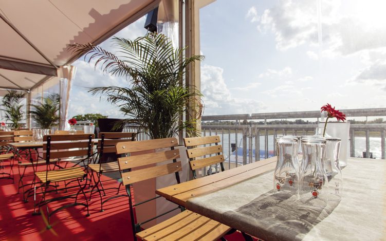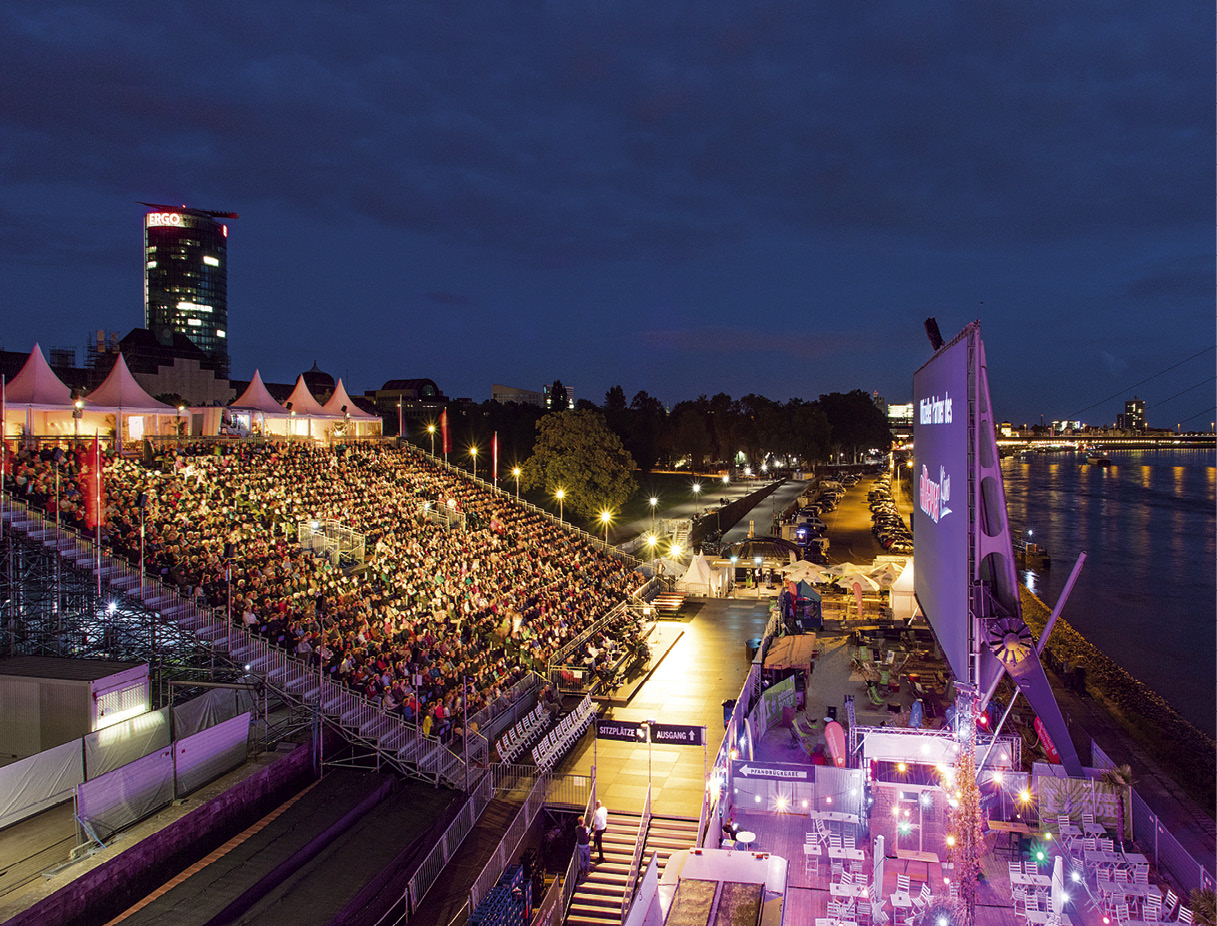 Das Open Air Kino ist das Herzstück der Venue. Auf 400 Quadratmetern – der weltweit größten hydraulischen Leinwand – können hier 1.800 Besucher in lauen Sommernächten Filme genießen. Zudem bietet das Kino mit der Sky Lounge eine überdachte und exklusive Dinner- und Partylocation am höchsten Punkt der Kinotribüne. „Möbliert je nach gewünschtem Eventcharakter als Restaurant oder mit Stehtischen eignet sich die Sky Lounge für circa 30 bis 130 Gäste – natürlich mit rotem Teppich“, weiß Stork. Dabei kann das jeweilige Event auch in der Sky Lounge oder im Kino noch weiter ausgestaltet werden. Sky Lounge-Events können beispielsweise mit einem Welcome-Counter oder dezentem Branding aufgewertet werden. Unternehmen haben zudem die Möglichkeit, im Vorprogramm einen Kundenwerbespot unterzubringen. „Last but not least bieten wir natürlich auch die Möglichkeit für ein romantisches Candle-Light-Dinner in der Sky Lounge“, resümiert Stork. „Damit der Abend bei uns auch ganz sicher unvergesslich wird.“