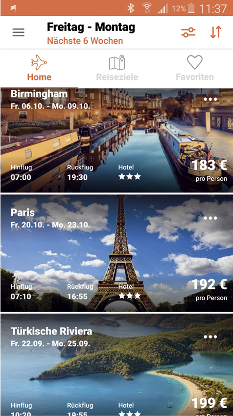 Wer viel arbeitet, der braucht auch mal eine Auszeit. Da Zeit bekanntlich Geld ist, bietet sich für Berufstätige oft nur das Wochenende zur Entspannung an. Mit der Reise-App weekengo können Sie ganz einfach ein passendes Wochenendangebot auf einen Blick und zudem die besten Deals für Flüge und Hotels finden. Die App ermöglicht Ihnen die Auswahl eines oder mehrerer Abflughäfen und findet sofort die beste Flug- und Hotelkombination zu allen Reisezielen. Shopping oder Kultur? Oder doch lieber Faulenzen am Strand? Legen Sie einfach ein Thema für eine Wochenendreise fest. Filtern Sie Suchergebnisse nach Reiseziel, Hotelkategorie, Verpflegung, Budget und mehr. Wer es gern edel mag oder seinem Partner etwas Besonderes bieten möchte, für den gibt es den Luxusbutton. Mit ihm finden Sie die besten Deals für 5-Sterne-Hotels. Lassen Sie sich von tollen Reisezielen inspirieren und nutzen Sie die App für ein entspanntes oder spannendes Wochenende! Fazit: das mobile Reisebüro.