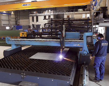 „Benno, kannst Du den Kran mal nach hinten fahren“, ruft Andreas Harmes seinem Mitarbeiter zu. Der nimmt die Steuerung in die Hand: Wie von Geisterhand schwebt die Kette in Richtung Ausgang. Bis 12,5 Tonnen können an den schweren Eisenhaken gehängt werden. Kurz vor dem „Schwesterkran“, ebenfalls mit einer Tragkraft von 12,5 Tonnen, stoppt Benno die Fahrt. „Die Komponenten werden immer größer“, erzählt der 49-jährige Diplomingenieur am neuen Firmenstandort an der Willicher Gießerallee 28. Seit Anfang Mai produziert Harmes Unternehmen, die ME-Metall GmbH, in der 2600 Quadratmeter großen Produktionshalle Spezialanfertigungen aus hochwertigen Stählen: Rekuperatoren, Brennkammern, Rohrleitungen, Lufterhitzer, Stahlbau, Spezialarmaturen und Apparate. In der Produktionshalle, die noch um rund ein Drittel erweitert werden kann, sieht sich Harmes zukunftssicher aufgestellt. „Am alten Standort sind wir bald an unsere Grenzen gestoßen.“ Auch die beiden anderen Firmen der Gruppe, RBU und HBS, zogen mit nach Willich. „Die Konzentration auf einen Standort bringt riesige Synergieeffekte mit sich“, sagt Harmes. „Man geht eben mal runter in die Produktion, um Dinge zu klären. Und die kaufmännischen Mitarbeiter erhalten einen Eindruck davon, was sie gerade auf die Reise schicken“, fährt der Firmenchef fort. Rund 50 Mitarbeiter sind in der Gruppe derzeit beschäftigt. „Begonnen hat alles bei RBU, der Rolf-Becker-Umwelttechnik“, erinnert sich der Diplom Ingenieur. 2009 übernahm er das Drei-Mann-Team und entwickelte es kontinuierlich weiter. 17 Mitarbeiter umfasst die RBU GmbH & Co KG, die Prozessgassonderarmaturen für Zementwerke, Müllverbrennungsanlagen, Kraftwerke, Schiffsbau und Stahlindustrie mit hoher thermischer Belastung konstruiert. Um die Kundenwünsche zu erfüllen, erweiterte er das Portfolio um die HBS, die sich um die Montage der Anlagen kümmert und 2014 um die ME Metall (siehe Kasten), die die hochwertigen Komponenten und Anlagen nach Kundenzeichnungen fertigt.