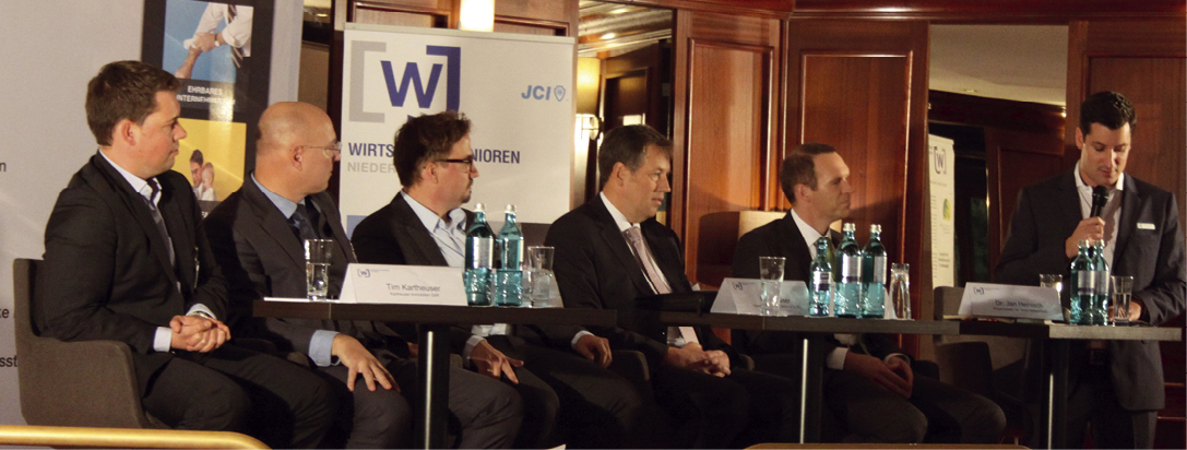 Mehr als 70 Gäste waren am 20. Oktober der Einladung der Wirtschaftsjunioren (WJ) Niederberg zur dritten Podiumsdiskussion gefolgt. Die Bürgermeister der Städte Velbert und Heiligenhaus, Dirk Lukrafka und Dr. Jan Heinisch, Dr. Ulrich Biedendorf (Geschäftsführer Standortpolitik IHK zu Düsseldorf) sowie die Wirtschaftsjunioren Felix Kaiser und Tim Kartheuser diskutierten darüber, wie die Region Niederberg im Jahr 2025 wirtschaftlich und politisch aufgestellt sein wird. Großen Raum nahm dabei die Auseinandersetzung mit den Innenstädten ein. „Stationärer Einzelhandel hat sich immer schon durch Beweglichkeit ausgezeichnet“, sagte Dr. Ulrich Biedendorf. „Er wurde schon oft totgesagt in den vergangenen Jahrzehnten und hat doch immer überlebt. Er wird auch den Online-Trend überstehen.“ Es gehe aber darum, dass die Innenstädte sich den Veränderungen stellen und ihrer Rolle als Orte der Begegnung bewusst bleiben. Zudem sprachen die Teilnehmer u.a. über Chancen und Gefahren der Digitalisierung in der Industrie. Dabei waren sich alle einig, dass die großen Unternehmen der Region bereits gut aufgestellt sind. Allerdings sei die Frage, wo die Produktion in Zukunft stattfindet. Durch zunehmende Digitalisierung der Produktionsprozesse werde es einfacher, Produkte dort herzustellen, wo sie gebraucht werden. Moderiert wurde der Abend vom WJ-Kreisvorsitzenden