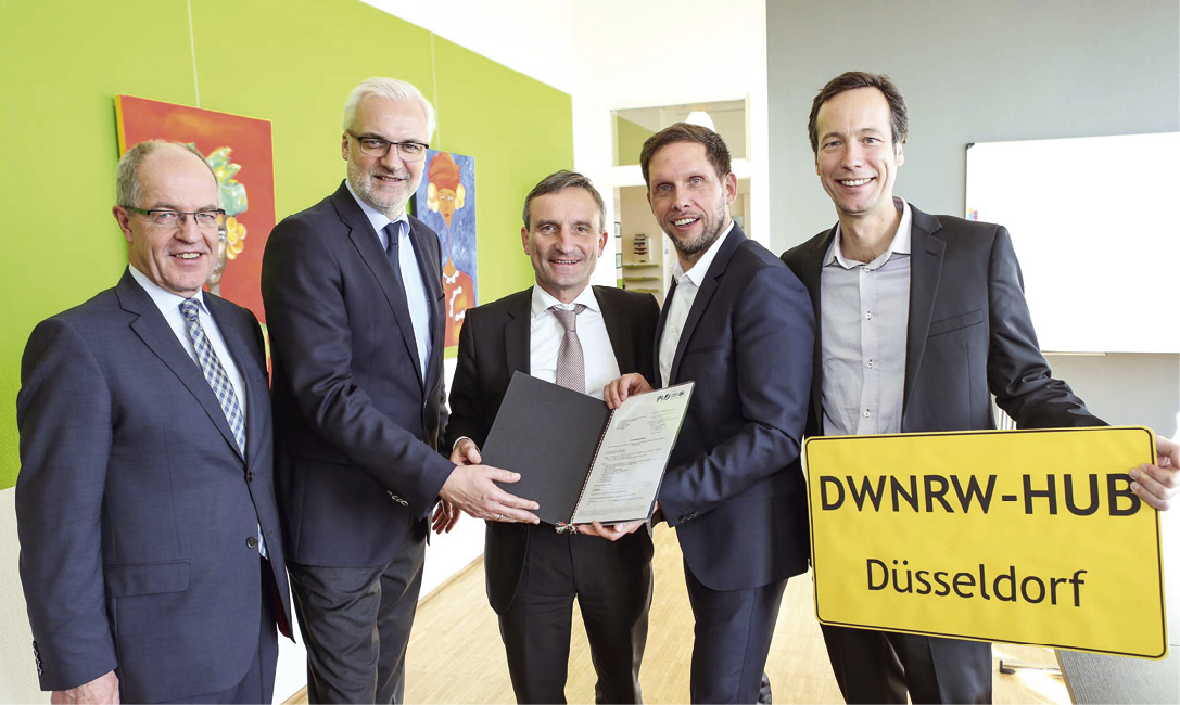 Am 6. Dezember übergab NRW-Wirtschaftsminister Garrelt Duin im Düsseldorfer Startplatz die Zuwendungsbescheide an die Verantwortlichen der sechs Plattformen der digitalen Wirtschaft. Darunter auch den digihub Düsseldorf/Rheinland, der seinen Sitz im Startplatz Düsseldorf, im Flossi-Haus im Medienhafen hat. „Um gute Ideen umzusetzen, braucht man Netzwerke und Unterstützungsstrukturen. Deshalb haben wir die DWNRW-Hubs zum Herzstück unserer Strategie für die Digitale Wirtschaft gemacht. Durch die sechs regionalen Plattformen im ganzen Land schafft NRW die richtigen Voraussetzungen für den digitalen Wandel. Die Zahl der Menschen, die sich bereit erklärt haben, mitzumachen und anzupacken, zeigt, dass wir auf dem richtigen Weg sind, Digitalland Nummer Eins zu werden“, sagte Minister Duin Die Geschäftsführer des digihub Düsseldorf/Rheinland, Peter Hornik und Dr. Klemens Gaida, bringen viel Start-up- und Konzern-Erfahrung ein: Peter Hornik ist unter anderem Mitgründer und Geschäftsführer des Startup-Inkubators 1st Mover sowie Mitinitiator der Start-up-Sprints in Düsseldorf und war bis zum Sommer Berater für den Eon Agile Accelerator. Dr. Klemens Gaida war ebenfalls Gründer und Geschäftsführer von 1st Mover, ehemaliger Vodafone-Innovationsmanager und langjähriger IKT-Unternehmensberater. „Ich bin stolz darauf, dass Düsseldorf den Zuschlag für den digihub bekommen hat. Damit haben wir noch mehr Möglichkeiten, Düsseldorf als Start-up- und Digitalwirtschaft-Metropole voranzubringen“ erklärte Düsseldorfs Oberbürgermeister Thomas Geisel. Er danke zudem allen Kooperationspartnern, wie der IHK Düsseldorf, der WFMG Mönchengladbach, der Digitalen Stadt, den IHKs Mittlerer Niederrhein, Niederrhein und Wuppertal sowie dem Kreis Mettmann, „um hier nur einige der mehr als 40 Partner zu nennen.“