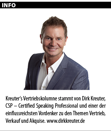Vor Kurzem im Fitnessstudio: Die Frau neben mir macht schon den dritten Satz einer Bauchübung. Biss hat sie! Nur die Übung macht sie leider völlig falsch: So trainiert sie nicht ihre Bauchmuskeln, sondern ruiniert sich nur ihren Rücken! Soll ich sie darauf ansprechen? Es geht mich ja nichts an. Okay, ich tu’s doch: „Du, wenn du die Übung ohne Schwung machst, hast du mehr davon und …“ Weiter bin ich nicht gekommen! Sie brach ihre Übung abrupt ab und meinte nur: „Das stimmt nicht! Ich mache die Übung schon immer so!“ Zwei Erkenntnisse ziehe ich aus dieser Situation. Erstens: Das nächste Mal halte ich den Mund. Ich bin doch nicht der Fitnesstrainer! Zweitens: Es gibt wirklich Menschen, die meinen, bloß weil sie etwas schon lange machen, wäre es deshalb auch gleich richtig. Kurt Tucholsky soll einmal gesagt haben: „Glaube keinem, der dir sagt, dass er das schon seit 20 Jahren macht. Man kann auch eine Sache 20 Jahre lang falsch machen!“ Ich bin davon überzeugt, dass es sich lohnt, sein Handeln und seine Glaubenssätze immer wieder zu hinterfragen und die Frage zu klären: Ist das der beste Weg? Wie oft werde ich von Kunden angefragt, um Ihnen neue Wege für die erfolgreiche Neukundengewinnung zu zeigen, um dann in der Analyse oder schon im Vorgespräch festzustellen, dass es für eine drastische Umsatzsteigerung keiner neuen Kunden bedarf, sondern einer Potenzialausschöpfung der Bestandskunden oder einer zielgerichteten Kundenrückgewinnung.