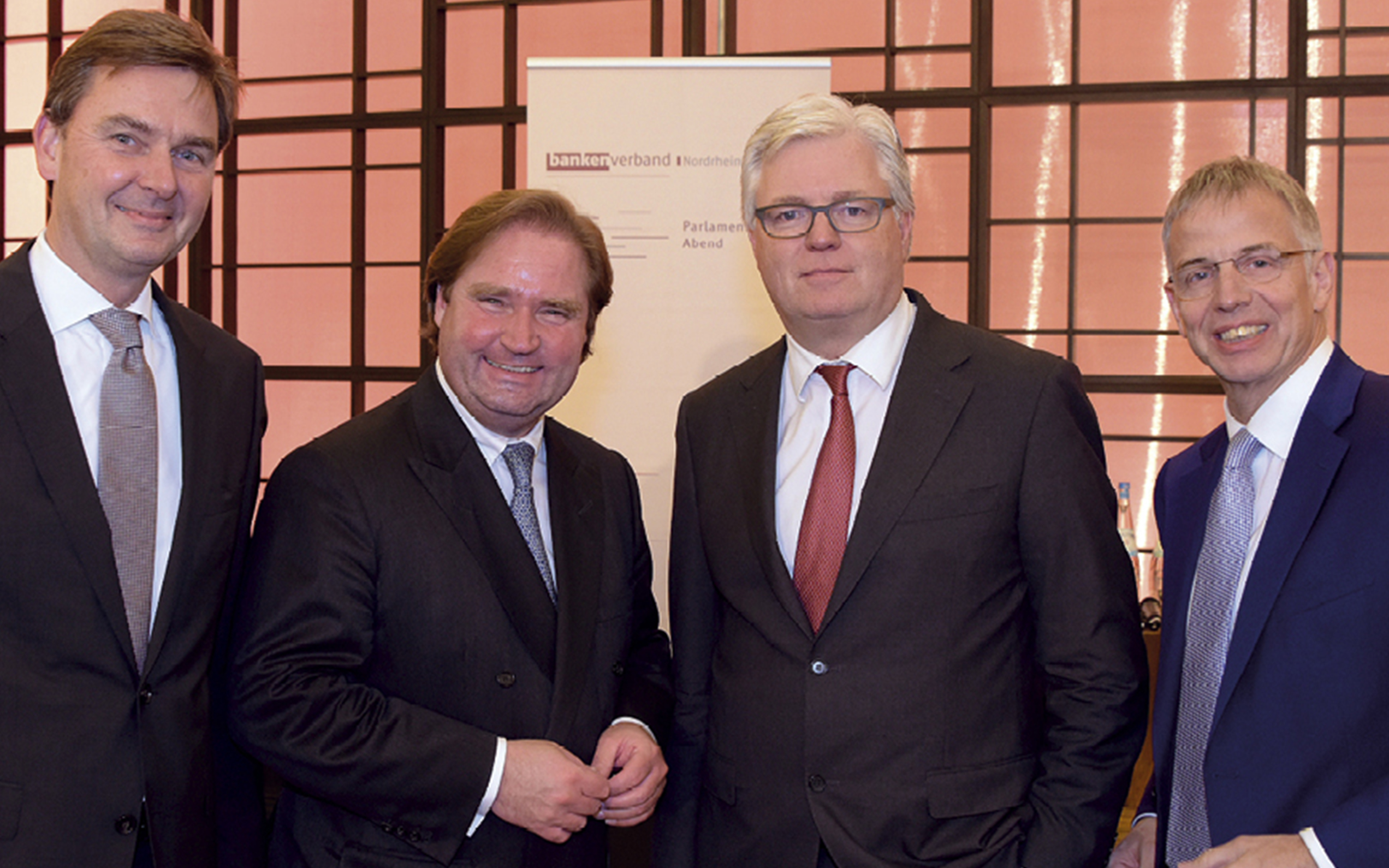 Mit einstimmigem Votum hat die Mitgliederversammlung des Bankenverbands Nordrhein-Westfalen am 15. November 2017 turnusgemäß Dr. Andre Carls, Vorstand des Firmenkundengeschäfts in der Vertriebsregion West der Commerzbank, als neuen Vorsitzenden sowie einen neuen Gesamtvorstand gewählt. Seine beiden Stellvertreter sind Thomas Buschmann von der Deutschen Bank und Dr. Thomas A. Lange von der National-Bank. Wiedergewählt wurden Andreas Glaser von der Santander Consumer Bank sowie Berthold Rüsing von der Targobank. Neu im Vorstand vertreten sind Markus Bolder vom Bankhaus Lampe und Dr. Jan Wilmanns von HSBC Trinkaus und Burkhardt. In seinen Dankesworten für das langjährige ehrenamtliche Engagement hob der neue Vorsitzende Dr. Andre Carls insbesondere die Arbeit seines Vorgängers Martin Renker hervor: „Er hat die Modernisierung des Bankenverbands vorangetrieben und die Sichtbarkeit gegenüber der Politik verbessert. Verbandsarbeit bedeutete für ihn nicht nur Jammern über den Regulierungsdruck. Es ging ihm vielmehr darum, konstruktive Lösungsvorschläge in die politische Diskussion zu tragen.“ Eine Satzungsänderung sieht vor, dass künftig nicht nur private Banken Mitglieder im Verband werden können. Als Grund für diese Maßnahme erklärte Dr. Carls: „Die Finanzwelt verändert sich, es kommen weitere Marktteilnehmer wie Fintechs, Wertpapierdienstleister, Family Offices und mehr hinzu, die ähnliche Herausforderungen wie private Banken haben.“ Anlässlich des Parlamentarischen Abends empfing der Bankenverband Nordrhein-Westfalen rund 250 Gäste aus Politik, Wirtschaft und Gesellschaft. Festredner waren u.a. NRW-Finanzminister Lutz Lienenkämper und Andreas Krautscheid, Mitglied der Hauptgeschäftsführung des Bundesverbandes deutscher Banken.