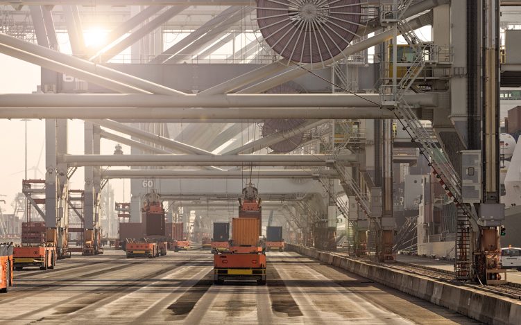 Moderne Containerhäfen sind ein schönes Beispiel für perfekt optimierte Intralogistik. Fahrerlose Transportsysteme agieren Hand in Hand mit halbautomatischen Containerbrücken und bestücken dabei modernste Lagersysteme in Echtzeit (© VanderWolf Images – stock.adobe.com)