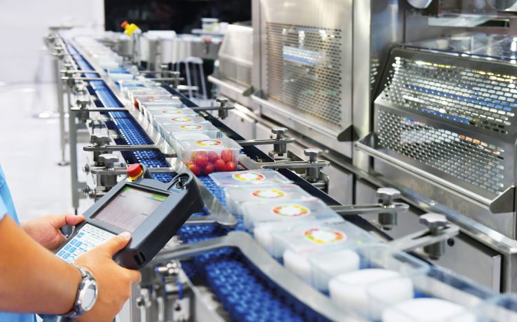 Ein Techniker prüft und steuert den Transfer von Lebensmittelbehältern auf einem automatisierten Fördersystem in der Produktion. Die Ernährungsindustrie weiß um den Vorteil automatisierter Intralogistik (© I Viewfinder – stock.adobe.com)