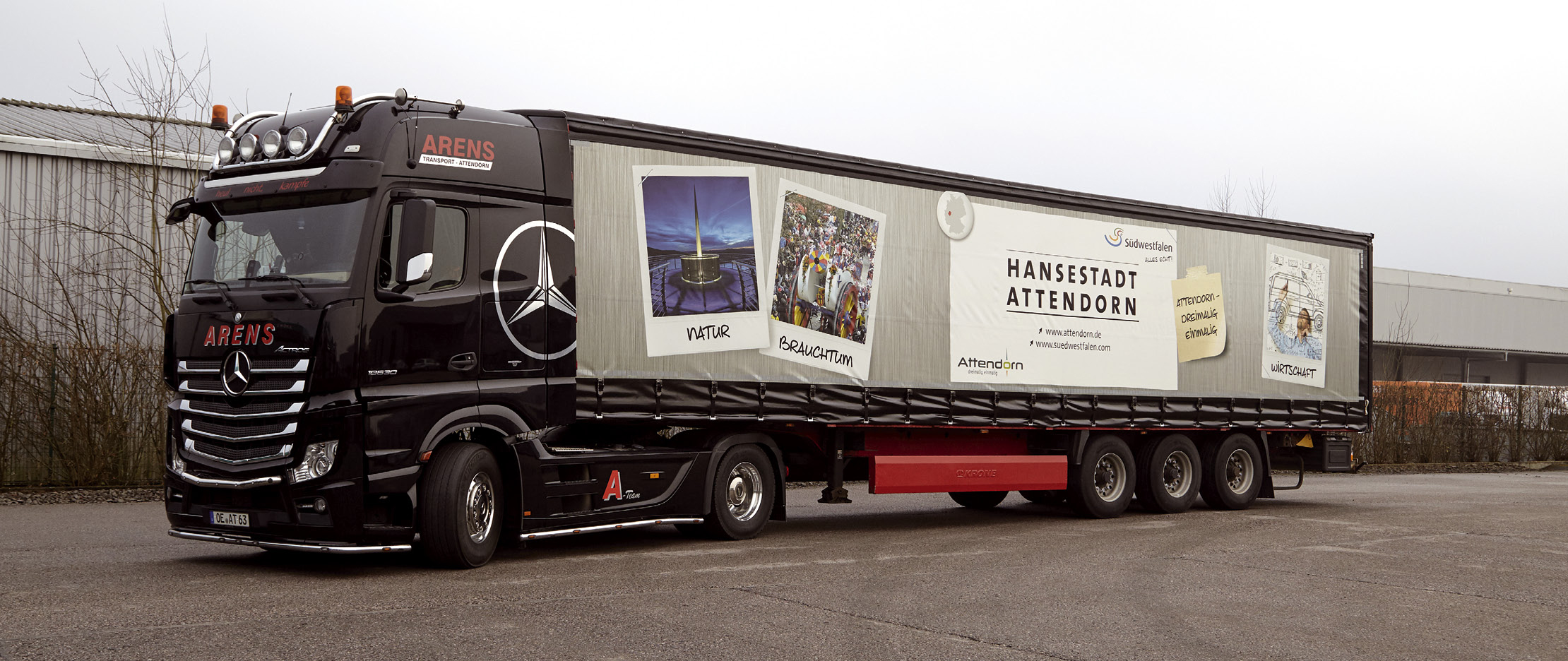 Attendorn gibt Gas: Das Logistikunternehmen Arens Transport GmbH und die Hansestadt Attendorn schickten gemeinsam mit der Südwestfalen Agentur offiziell den 15. Werbe-Lkw auf die deutschen Autobahnen. Der PS-starke Botschafter macht sich ab sofort auf den Weg, um gleichermaßen für Südwestfalen als die stärkste Industrieregion NRWs und die Stadt Attendorn zu werben.