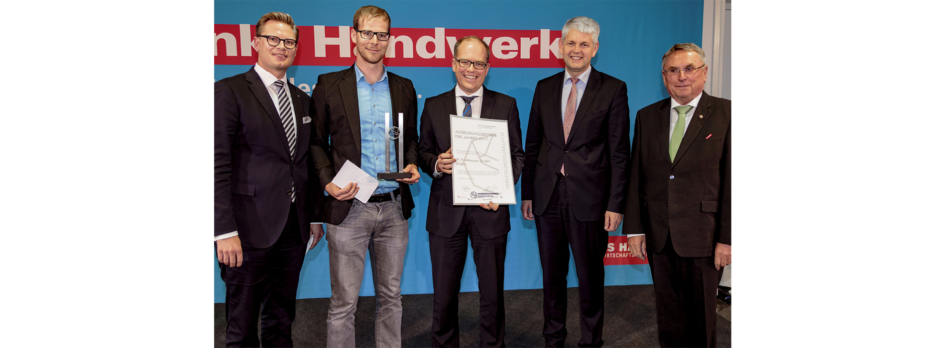 Stolz und Freude bei der Bauunternehmung W. Hundhausen, die von der Handwerkskammer Südwestfalen als „Ausbildungsbetrieb des Jahres 2017“ in der Kategorie „Innovation und Jungunternehmen“ ausgezeichnet wurde. Der begehrte Preis wurde durch Staatssekretär Christoph Dammermann vom nordrhein-westfälischen Ministerium für Wirtschaft, Innovation, Digitalisierung und Energie überreicht. Schirmherr des Wettbewerbs war NRW-Wirtschaftsminister Andreas Pinkwart. In der Laudatio hob Robert Schäfer vom Preisstifter Signal Iduna Versicherung hervor, dass das Unternehmen neue Wege in der Betreuung der Auszubildenden geht. Dies erschöpfe sich nicht nur in der Vermittlung der Ausbildungsinhalte. Durch Entwicklungsgespräche, engagierte Förderung von jungen Leuten mit Förderbedarf, Maßnahmen zur Teambildung und die Stärkung der Persönlichkeitsentwicklung habe das Unternehmen die bisherige Ausbildungspraxis deutlich verbessert. „Wir haben erkannt, dass die Ausbildung für den Unternehmenserfolg immer wichtiger wird. Mit einer neuen Personalstelle haben wir mit Daniel Wirth einen engagierten Macher für die jungen Leute gewonnen. Wir freuen uns sehr, dass unsere Anstrengungen so positiv aufgenommen werden“, erklärte Stephan Hundhausen, dessen Unternehmen im Juli auch die Bezeichnung „Top Ausbildungsbetrieb“ mit der Note „sehr gut“ vom Deutschen Institut für Qualitätsstandards und -prüfung (DIQP) erhalten hatte. Derzeit befinden sich 31 Nachwuchskräfte in Ausbildung bei der Unternehmensgruppe. Die hohe Ausbildungsquote von über zehn Prozent sticht im Vergleich mit anderen Unternehmen und Branchen heraus. In der Industrie liegt diese Quote bei lediglich drei bis fünf Prozent. Für die Auszeichnung als Ausbildungsbetrieb des Jahres hatten sich 50 Betriebe beworben, zehn wurden nominiert.