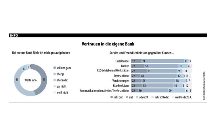 Um den Ruf der Banken ist es nicht zum Besten bestellt, so scheint es zumindest. Tatsächlich hat das Image der Branche im Zuge der Finanzkrise ab 2007 gelitten, doch von einem gravierenden Vertrauensverlust kann keine Rede sein. Dies zeigt eine repräsentative Studie des Marktforschungsunternehmens GfK zum Vertrauen der Deutschen in ihre Kreditinstitute. Demnach haben 82 Prozent der Befragten eher Vertrauen (42 Prozent) oder sogar volles Vertrauen (40 Prozent) zu ihrem Kreditinstitut. Bemerkenswert: Die eigene Meinung zu den Banken ist deutlich positiver (56 Prozent gut/sehr gut) als der von den Befragten wahrgenommene Ruf der Branche in der öffentlichen Meinung (26 Prozent gut/sehr gut). Zehn Jahre nach dem Ausbruch der Finanzkrise hat der Bankensektor also scheinbar verlorenes Vertrauen wieder zurückgewonnen. Die Herausforderungen für die Finanzbranche sind dessen ungeachtet weiterhin groß. Im vergangenen Jahr ist die Gesamtzahl der Kreditinstitute in Deutschland um 72 auf 1.888 Institute gesunken. Dies entspricht einem Rückgang von 3,7 Prozent im Vergleich zum Vorjahr. „Der Konsolidierungsprozess hat an Fahrt gewonnen“, sagt Dr. Andreas Dombret, Vorstandsmitglied der Deutschen Bundesbank. „Dies ist ein klares Zeichen dafür, dass der Druck durch Wettbewerb und Niedrigzinsumfeld weiter hoch ist und die Banken sich veranlasst sehen, Kostenstrukturen und Vertriebswege auf den Prüfstand zu stellen.“ Der Zwang zu sparen zeigt sich auch bei den Bankfilialen, deren Zahl die Branche in den vergangenen Jahren stark reduziert hat. Die persönliche Beratung vor Ort hat bei den Deutschen aber weiterhin einen hohen Stellenwert: In einer repräsentativen Meinungsumfrage der GfK zum Online-Banking in Deutschland widersprechen 86 Prozent der Befragten der Aussage, dass Banken heutzutage keine Filialen mehr bräuchten. Bei diesem Thema besteht eine große Einigkeit zwischen Alt und Jung. Auch Thomas Schlüter, Leiter der Kommunikationsabteilung beim Bundesverband deutscher Banken (BdB), rechnet nicht mit einem Ende der klassischen Bankfiliale. „Derzeit haben wir noch rund 32.000 Filialen in Deutschland. Es ist davon auszugehen, dass sich diese Zahl in den nächsten Jahren reduzieren wird. Hauptursache ist das Kundenverhalten. Filialen werden weniger besucht, die Kunden nutzen für Überweisungen und den Zahlungsverkehr lieber das Online-Banking. Die Banken reagieren darauf unterschiedlich, abhängig von den jeweiligen Wünschen ihrer Kunden. So gibt es beispielsweise zunehmend eine Spezialisierung und Umgestaltung der Filialen. Ein Auslaufmodell ist der Bankberater daher derzeit nicht.“