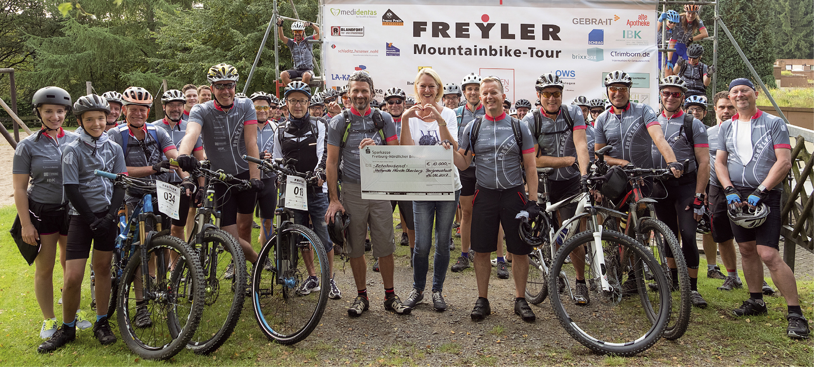 80 Teilnehmer erradelten bei der von der Freyler Industriebau GmbH in Bergneustadt organisierten sechsten Mountainbike-Tour durchs Bergische Land insgesamt 2.560 Kilometer. „Wie jedes Jahr gehen das Start- und Kilometergeld sowie die kompletten Spendengelder an eine wohltätige Organisation“, freut sich Torsten Prauser, Geschäftsbereichsleiter von Freyler Industriebau Bergneustadt. Unterstützt wurde die Initiative durch zahlreiche Unternehmen aus der Region – teils auf dem Fahrrad, teils mit einer Spende. Bettina Hühn, Geschäftsführerin der Ursula-Barth-Stiftung, nahm den symbolischen Spendenscheck in Höhe von 10.000 Euro entgegen und freute sich über die Unterstützung, die das Projekt „Hilfe für Nick & Co. – Helfende Hände Oberberg“ dadurch erfährt. Die Ursula-Barth-Stiftung weiß, dass Kinder und Jugendliche unsere Zukunft sind und setzt deren Wohlbefinden an erste Stelle. Eine besondere Unterstützung bekommt der Nachwuchs mit geistigen, psychischen oder körperlichen Beeinträchtigungen sowie Eltern und Erziehende in schwierigen Situationen. Das Projekt kümmert sich um Familien mit schwer kranken Kindern in ausweglos erscheinenden Situationen, meist bestimmt durch eine lebensbedrohliche Diagnose. „Wir versuchen, auf allen möglichen Wegen zu helfen, sowohl finanziell als auch mit einer intensiven persönlichen Unterstützung und Beratung“, berichtet Bettina Hühn.