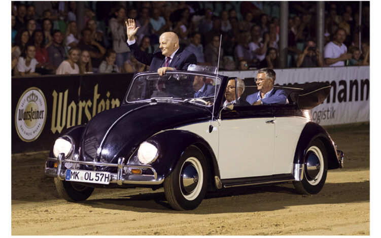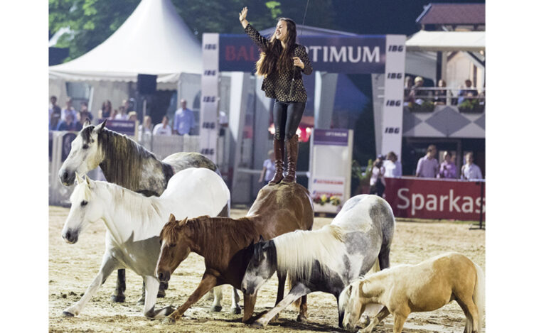 Am Samstagabend schloss eine grandiose Nacht der Show den 3. Turniertag. Highlights waren der Hundezirkus des erst zehnjährigen RTL-Supertalents Alexa Lauenburger, Yvonne Gutsches mitreißende Stuntshow, die zu Herzen gehende Freiheitsdressur der Französin Anne-Gaelle Bertho oder die Versteigerung von Hans Günter Winklers (†) Gerte zugunsten der Charity „Reiten gegen den Hunger“. Die Gerte der inzwischen verstorbenen Ausnahme-Springsportlegende, brachte 4.000 Euro für den guten Zweck ein. Ebenfalls für „Reiten gegen den Hunger“ angereist war die Schauspielerin und Welthungerhilfe-Botschafterin Gesine Cukrowski. Die beliebte Aktrice forderte das Publikum auf ihre sympathische Art und Weise dazu auf, via Mobiltelefon direkt zu spenden. Natürlich kam auch der Geburtstag des BALVE OPTIMUM nicht zu kurz: Die Jubiläumseinlagen bestanden unter anderem aus einer Modenschau mit der Reitsportmode der letzten 70 Jahre oder auch dem Einzug der Legenden: Hans Günter Winkler, Herbert Meyer, Andreas Ostholt, Otto Becker, Gabriele Grillo, Klaus Balkenhol, Willibert Mehlkopf, Hendrik Snoek und Sönke Sönksen wurden in VW-Oldtimer-Cabrios auf den Platz der Meister gefahren. Ein ganz besonderer Moment. Nach dem großen Zapfenstreich wurde noch das Tanzbein bei der „Warsteiner Party Night“ bis in die frühen Morgenstunden geschwungen.