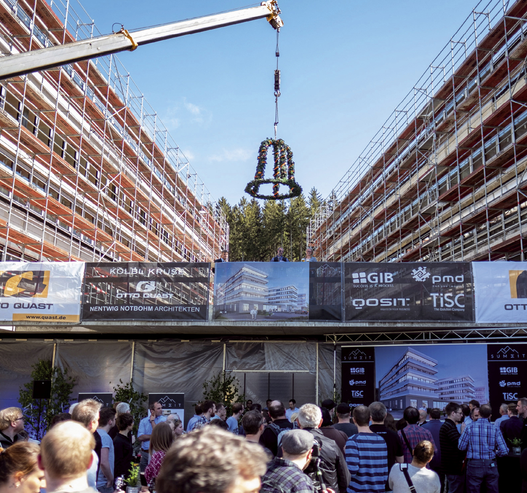 Knapp ein halbes Jahr nach Baubeginn steht im Siegener Gewerbegebiet Martinshardt bereits der Rohbau des geplant circa 13.000 Quadratmeter großen fünfstöckigen Gebäudekomplexes „The Summit“. Die Fertigstellung ist für das erste Halbjahr 2019 geplant. Beim Richtfest betraten die meisten der knapp 300 Mitarbeiter der Unternehmen pmdtechnologies ag, TiSC AG, GIB mbH und QOSIT Informationstechnik GmbH zum ersten Mal ihre zukünftige Wirkungsstätte. Der imposante Neubau besteht aus insgesamt fünf Geschossen. Auf einem Sockelgeschoss sind drei Riegel in einer Kammstruktur angeordnet. Zusätzlich entsteht ein separates, erweiterbares Parkhaus mit rund 250 Stellplätzen. Mit diesem Fest wurde dem Bauteam aus dem Hause Quast ein erster Dank ausgesprochen, welches seit Baubeginn Ende August 2017 auf der Baustelle dabei ist. Nach dem Umzug in das Gebäude erwarten die Bewohner und Gäste im Erdgeschoss ein großzügiger, moderner Empfangsbereich, ein Mitarbeiterrestaurant und ein Fitnessstudio. Daneben wird es in „The Summit“ Werkstätten, Reinraumlabore, Konferenzbereiche und ein eigenes Rechenzentrum geben. Ab dem zweiten Geschoss sind die Büros untergebracht. Entworfen wurde die neue Heimat der innovativen Siegener Unternehmen durch das Hamburger Architekturbüro nentwig.notbohm Architekten. Kölbl Kruse aus Essen zeichnet sich als Projektleiter für den Bau verantwortlich. Die Ausführung wurde dem Siegener Bauunternehmen Otto Quast übertragen.