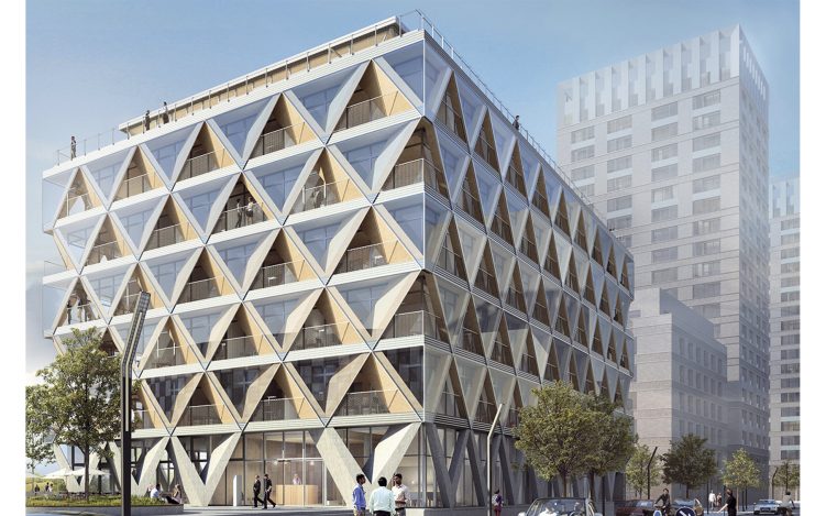 Aber nicht nur die politischen Rahmenbedingungen sind für den Holzbau gegenwärtig günstig. „Es gibt in unserem Bundesland weitere ,Leuchtturmprojekte’, die den aktuell möglichen Stand des Holzbaus bzw. des Holzhybridbaus dokumentieren.“ So entsteht derzeit nach Aussage des Verbandsvorsitzenden mit „The Cradle“ das erste Holzhybrid-Bürogebäude in Düsseldorf. „Im Herzen des Medienhafens, der sich schon jetzt durch außergewöhnliche Architekturprojekte auszeichnet, wird zurzeit nach dem ,Cradle-to-Cradle’-Prinzip ein Architektur-Solitär gebaut, bei dem nahezu die komplette Fassade aus Holzelementen gefertigt wird und andere Stoffe wie Beton oder Kunststoff ersetzt werden.“ Die Baustoffe, mit denen „The Cradle“ konstruiert wird, sowie der Gebäudebetrieb sollen gegenüber konventionellen Bauweisen nach einer überschlägigen Berechnung des Bauherren mehr als 30 Prozent CO₂ einsparen.