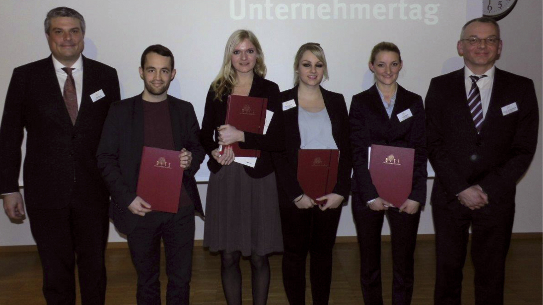 Die Verleihung des BiTS-Wissenschaftspreises stand im Mittelpunkt des 14. BiTS-Unternehmertags, bei dem sich 150 Unternehmer aus der Region über finanzwirtschaftliche Themen und hochschulspezifische Perspektiven informierten. Preisträger sind Lisa Behrens, Rolf Hohl, Kathrin Gross und Katharina Müller, die sich über eine finanzielle Unterstützung und über die Veröffentlichung ihrer Arbeiten in einem Forschungsband freuen dürfen. Die Themen der Arbeiten reichen vom „Populismus der politischen Kommunikation in Europa“ über „Diversity Management“ bis hin zum „Bild der Marken“ und dem „Cradle to cradle-Prinzip“, der Vision einer abfallfreien Wirtschaft. BiTS-Rektor Prof. Stefan Stein betonte, dass gerade jetzt Mut und Unternehmergeist gefragt seien. Weitere Themen waren die Nullzinspolitik der EZB und ihre Folgen für den Mittestand (BiTS-Prof. Dr. Stefan Kooths, Leiter des Kieler Instituts für Weltwirtschaft), ein Vortrag des ehemaligen BiTS-lers Dr. Fabian Prystav über die Rolle von Informationen auf digitalen Kreditmarktplätzen sowie eine Vorstellung der studentischen Initiative der „Debating Society“ von Student Julian Vaterrodt.