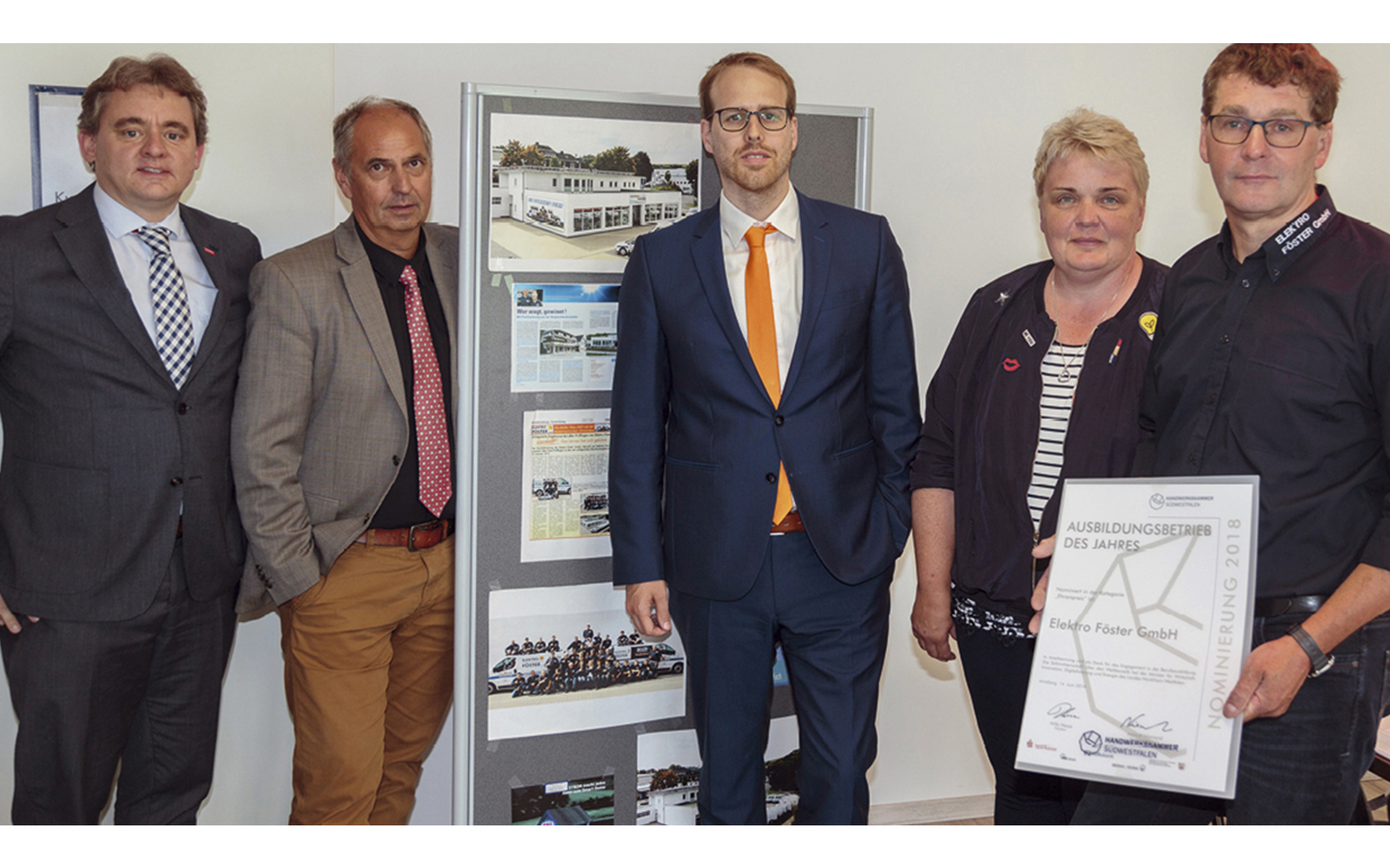 „Die Summe der Faktoren hat uns überzeugt, Elektro Förster für den diesjährigen Ausbildungspreis zu nominieren“, erklärte Fabian Bräutigam, Geschäftsführer der Handwerkskammer Südwestfalen, bei der Übergabe der Nominierungsurkunde im Schmallenberger Betrieb. In der Kategorie „Ehrenpreis“ wurde das Unternehmen für den Ausbildungspreis der Handwerkskammer Südwestfalen vorgeschlagen. Wie wichtig dem Betrieb das Thema Ausbildung ist, beweist Geschäftsführer Meinolf Hesse, der seit 2002 an der Spitze des Unternehmens steht, in vielen Bereichen: Seit 1981 hat der Betrieb 43 junge Menschen ausgebildet. Alle erzielten durchweg gute Prüfungsergebnisse. Zwei Mitarbeiter engagieren sich zudem ehrenamtlich in Prüfungsausschüssen des Handwerks. Das Interesse junger Menschen für das Handwerk im Allgemeinen und das Elektrohandwerk im Besonderen zu wecken steht bei Meinolf Hesse jedoch an oberster Stelle. Dazu stellt der Betrieb regelmäßig viele Praktikumsplätze bereit und bietet Schülern Ferienjobs an. In Sachen Nachwuchswerbung lässt das Unternehmen kaum eine Möglichkeit aus. Von der regelmäßigen Teilnahme an Ausbildungs- und Jobmessen, Workshops zur Berufsorientierung, mehrwöchigen Praktika bis hin zu Schnuppertagen zum Girls‘ oder Boys‘ Day. Auch für die Integration von Asylbewerbern macht sich Elektro Förster stark. Um ihnen den Einstieg in die Ausbildung zu erleichtern, bietet das Unternehmen Ausbildungsvorbereitung an und hilft ihnen, sich fit für die Ausbildung zu machen. So beginnt in diesem Jahr ein syrischer Geflüchteter seine Lehre in dem Schmallenberger Betrieb, nachdem er zuvor bereits ein Langzeitpraktikum absolviert hatte.