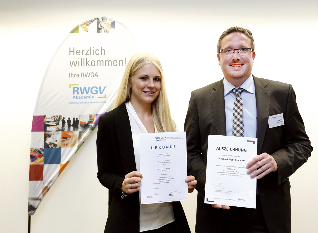 „Die genossenschaftlichen Banken gehören zu den Top-Ausbildern in Deutschland – und ihre Auszubildenden sind richtig starke Nachwuchskräfte.“ Dieses Lob von Monika Lohmann, der Abteilungsleiterin der Rheinisch-Westfälischen Genossenschaftsakademie in Forsbach (RWGA), galt am Montag auch Luisa Iarossi und Lea Hochstein von der Volksbank Bigge-Lenne. Sie sind zwei von 67 Bankkaufleuten des aktuellen NRW-Abschlussjahrgangs, die mit „sehr gut“ abgeschlossen haben. Die zwei Azubis seien für ihr weit überdurchschnittliches Engagement mit einem herausragenden Prüfungsergebnis belohnt worden, so Lohmann. Für die Volksbank Bigge-Lenne war das exzellente Abschneiden ihrer jungen Mitarbeiterinnen ein echter Grund zur Freude. Vorstandssprecher Peter Kaufmann sagte: „Es ist nicht nur die exzellente Abschlussnote, die uns glücklich und stolz macht, sondern auch ihre persönliche Entwicklung. All das sehen wir als Bestätigung für die gute Arbeit unserer Ausbilder.“