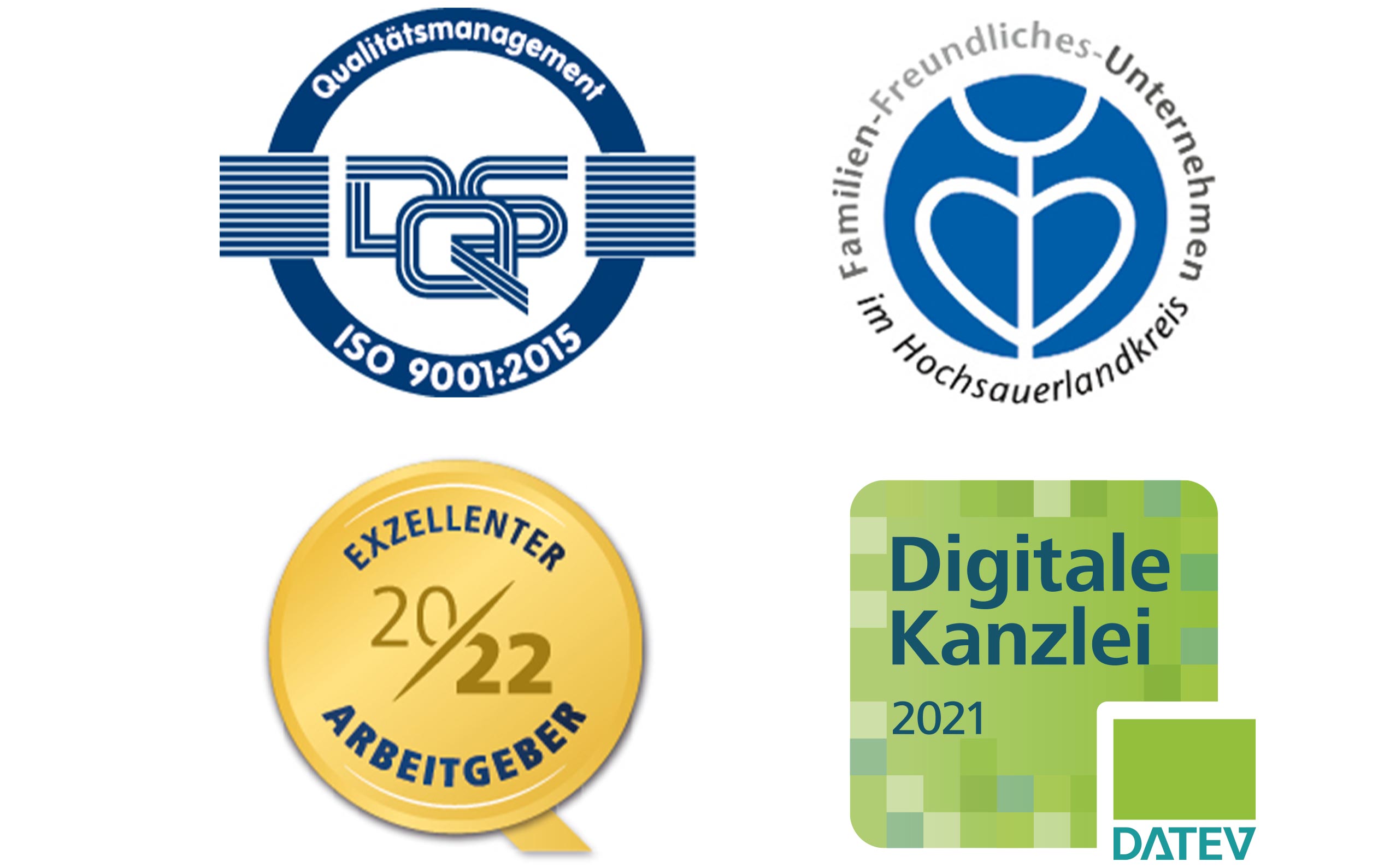 Es ist wichtiger denn je, auf dem neuesten Stand und für alle Eventualitäten gewappnet zu sein. Stetige Aus- und Weiterbildungen der Mitarbeiter*innen sowie zahlreiche Zertifizierungen und Gütesiegel prägen unsere Kanzlei. Genannt seien hier die Auszeichnungen als Exzellenter Arbeitgeber 2022, Familienfreundliches Unternehmen im HSK, Digitale Kanzlei und nicht zuletzt die Zertifizierung nach DIN EN ISO 9001:2015.