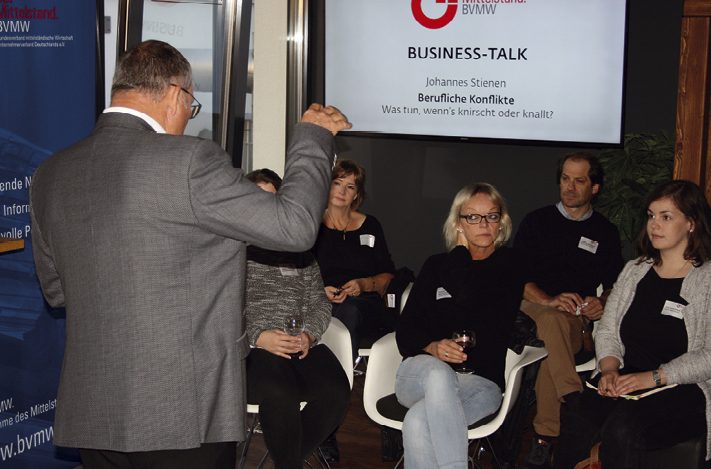 Beim Business-Talk des BVMW im Veranstaltungsraum medium (Kaiserhaus Arnsberg) ging es jetzt um das Thema „Berufliche Konflikte – was tun, wenn’s knirscht und knallt?“. Referent Johannes Stienen aus Meschede lieferte den Teilnehmern Anhaltspunkte, wie sich Probleme und Konflikte möglichst rechtzeitig vermeiden oder lösen lassen. Der Coach erklärte auch, woran man Mobbing erkennt, „denn gerade bei diesem Thema ist die Wahrnehmung häufig unterschiedlich“. Nach dem Fachvortrag nutzten die Teilnehmer die Gelegenheit für ein lockeres Get-Together.