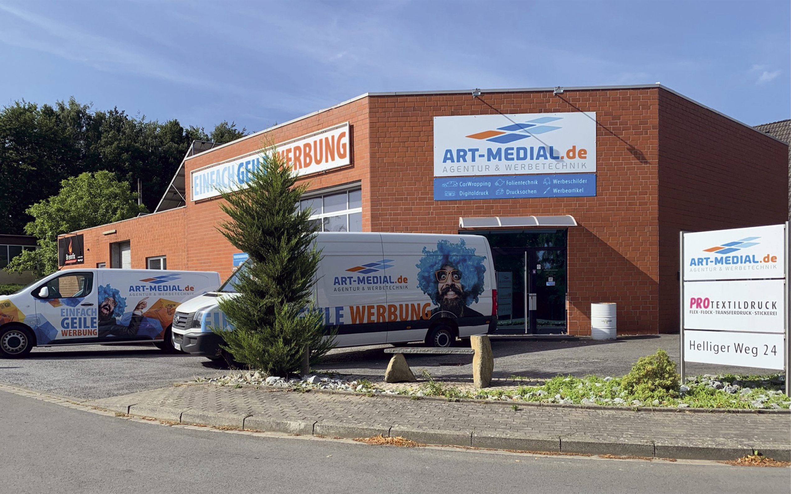 Etwa 3.000 Werbeschilder produziert das Unternehmen im Spenger Gewerbegebiet Wallenbrück jedes Jahr. art-medial bedruckt knapp 100.000 Laufmeter Folie und begleitet den Kunden durch den gesamten Prozess, angefangen von der Planung bis zur Montage der Werbeträger. Außergewöhnliche Fahrzeugbeschriftungen machen das Auto zur rollenden Reklame, auch das Unternehmen selbst setzt mit ihren fünf Einsatzfahrzeugen Akzente in der Region. Den fiktiven Mitarbeiter „Arndt Medial“ mit der blauen Lockenperücke hat wohl jeder in OWL schon mal gesehen.
