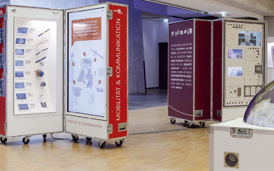 Form follows function. Medium auch. Die INNOspaceExpo „ALL.TÄGLICH!“ des Deutschen Zentrums für Luft- und Raumfahrt hat schon über 200.000 Menschen erklärt, warum Raumfahrt für alle wichtig ist. So geht Ausstellung 4.0, mobil, selbsterklärend, interaktiv: 27 Info- und Exponat-Cases, reinrollen, aufklappen, plug, play!